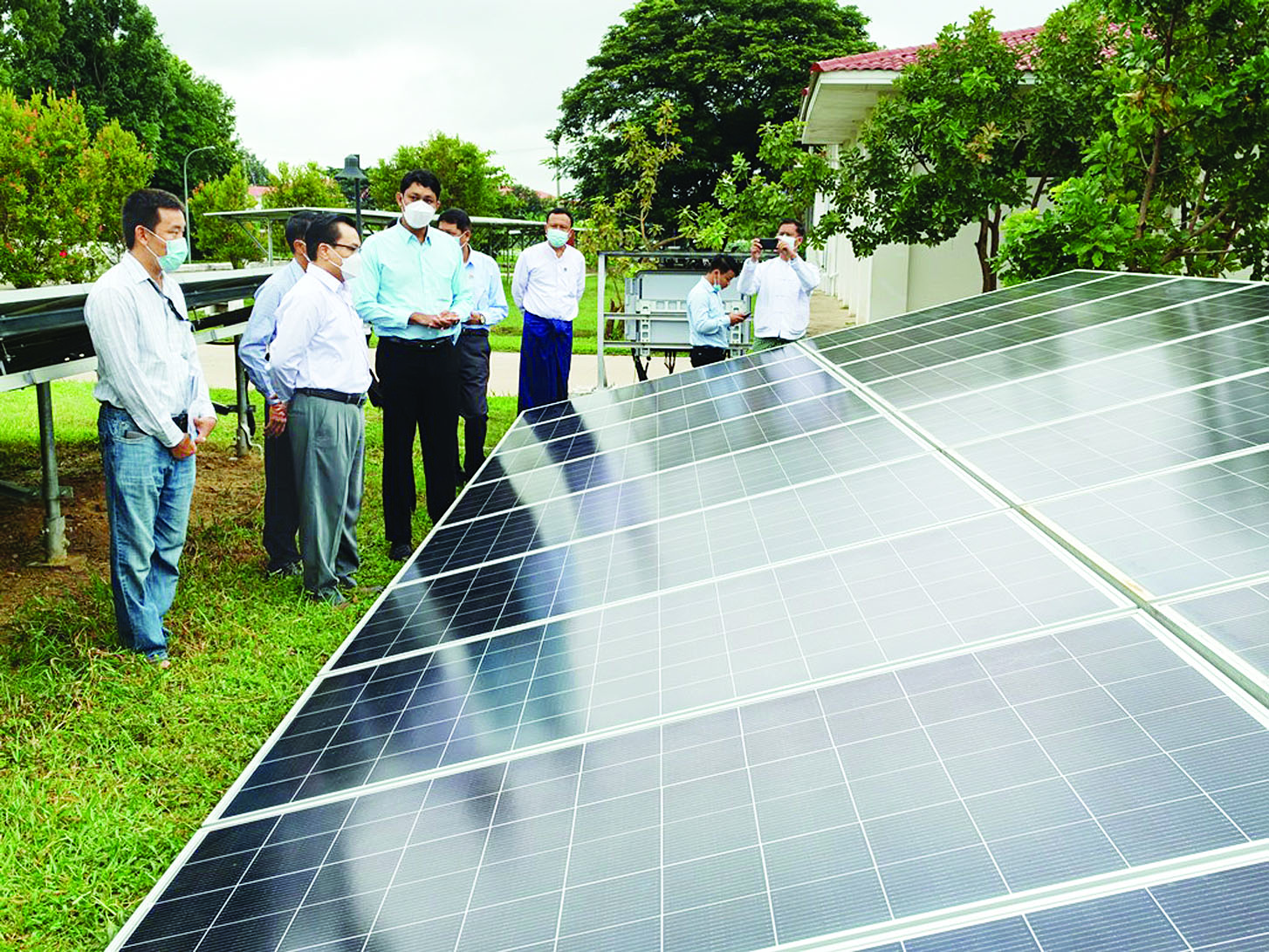ဒုတိယဝန်ကြီးနှင့် အဖွဲ့သည် Park Royal ဟိုတယ်တွင် တပ်ဆင်အသုံးပြုလျက်ရှိသည့် ဝပ်အား ၃၈၀ Monocrystalline Silicon ဆိုလာမော်ကျူး ၄၉၀ ၊ ၁၀၀ ကီလိုဝပ် အင်ဗာတာ သုံးခု တို့ဖြင့် တပ်ဆင်စွမ်းအား ၃၅၇ ကီလိုဝပ်ရှိသည့် Ground-mounted Solar PV System နှင့် နေပြည်တော် Junction Center ရှိ ဝပ်အား ၃၈၀ Monocrystalline Silicon ဆိုလာမော်ကျူး ၁၆၀၀ နှင့် ၁၀၀ ကီလိုဝပ် အင်ဗာတာ ငါးခုတို့ဖြင့် တပ်ဆင်စွမ်းအား ကီလိုဝပ် ၆၈၀ ရှိသည့် Rooftop Solar PV System ကို စစ်ဆေးကြည့်ရှုပြီး ဒုတိယဝန်ကြီးက နေရောင်ခြည် စွမ်းအင်သုံးလျှပ်စစ်ဓာတ်အား ထုတ်ပေးသော စီမံကိန်းများ အကောင်အထည်ဖော် တည်ဆောက်၍ နိုင်ငံတော်နှင့် ပြည်သူများ၏ လျှပ်စစ်ဓာတ်အားလိုအပ်ချက်ကို ဖြည့်ဆည်းဆောင်ရွက်ပေးလျက်ရှိကြောင်း၊ လက်ရှိတွင် မင်းဘူး (မဂ္ဂါဝပ် ၄၀) နှင့် သပြေဝ (မဂ္ဂါဝပ် ၃၀ ) ဓာတ်အားပေးစက်ရုံများမှ နိုင်ငံတော်ဓာတ်အားကွန်ရက်စနစ်နှင့် ချိတ်ဆက်၍ ဓာတ်အားပို့လွှတ်လျက်ရှိကြောင်း၊ ယခင်က ကျေးလက်ဒေသတွင်သာဆိုလာစနစ်များ တပ်ဆင်အသုံးပြုခဲ့ကြရာမှ ယခုအခါ မြို့ပြဒေသတွင်ပါ ယင်းစနစ်များ တပ်ဆင်အသုံးပြု လာပြီဖြစ်ကြောင်း၊ ယင်းသို့အသုံးပြုသည့်အတွက် အကျိုးကျေးဇူးများစွာ ရရှိကြောင်း၊ ဆိုလာစနစ်များအတွက် Perfor-mance Monitoring နှင့် Cleaning များသည်လည်း အရေးကြီးပါကြောင်း၊ Power Quality ကောင်းမွန်ရန် လိုအပ်ကြောင်း၊ တည်ဆဲလျှပ်စစ်ဥပဒေ၊ နည်းဥပဒေ၊ လုပ်ထုံးလုပ်နည်းများနှင့် နည်းပညာဆိုင်ရာ အရည်အသွေး သတ်မှတ်ချက် များအား လိုက်နာဆောင်ရွက်ရန် လိုအပ်ကြောင်း မှာကြားသည်။