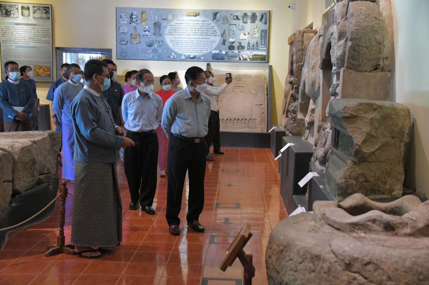ထို့နောက် နိုင်ငံတော်စီမံအုပ်ချုပ်ရေးကောင်စီဥက္ကဋ္ဌ နိုင်ငံတော်ဝန်ကြီးချုပ်၊ ဇနီးနှင့် အဖွဲ့ဝင်များသည် သရေခေတ္တရာ ယဉ်ကျေးမှုဇုန်အတွင်းရှိ သီရိခေတ္တရာပြတိုက်အတွင်း ခင်းကျင်းပြသထားသည့် အဆင်တန်ဆာနှင့် အသုံးအဆောင်များဆိုင်ရာ ပြခန်း၊ စာပေနှင့် ကိုးကွယ်ယုံကြည်မှုဆိုင်ရာပြခန်း၊ ရှေးခေတ်အသုံးအဆောင် ပစ္စည်းများ၊ စာပေဆိုင်ရာ အထောက်အထားများ၊ ပျူခေတ်အုတ်များ၊ ဗိသုကာလက်ရာများနှင့် ပျူခေတ် အသုံးအဆောင်ပစ္စည်းများ စသည့် ပြကွက်များကို တစ်ခုချင်းအသေးစိတ် စိတ်ဝင်တစား ကြည့်ရှုလေ့လာခဲ့ပြီး တာဝန်ရှိသူများ၏ တင်ပြချက်များအပေါ် သမိုင်းအထောက်အထားများအား စနစ်တကျ ထိန်းသိမ်းထားရှိရန်၊ ပြတိုက်အတွင်း ခင်းကျင်းပြသထားသည့် ဓာတ်ပုံများနှင့် ခုနှစ်၊ သက္ကရာဇ်များ၊ တူးဖော်ရရှိသည့် နေရာများကို အလွယ်တကူ လေ့လာသိရှိနိုင်ရေးအတွက်လည်း ရှင်းလင်းစွာ စာတန်းထိုးထားရန်လိုကြောင်း၊ ပျူစာဖြင့် ရေးထိုးထားသည့် ကျောက်စာများကို သမိုင်းပညာရှင်များဖြင့် ဘာသာပြန်ဆို၍ အများပြည်သူလေ့လာနိုင်ရေး ထားရှိရန်လိုကြောင်း၊ ရှေးခေတ်လက်ရာ ဒင်္ဂါးပြားများ၊ လက်ဝတ်ရတနာများကို အနီးကပ်ကြည့်ရှုလေ့လာနိုင်ရေး ခေတ်မီနည်းစနစ်များ အသုံးပြု၍ LED Screen များဖြင့် လေ့လာကြည့်ရှုနိုင်အောင် ဆောင်ရွက်ပေးထားရန်လိုကြောင်း၊ Digital Museum အဖြစ် အဆင့်မြှင့်တင်နိုင်ရေး ဆောင်ရွက်ရန်နှင့် အခြားလိုအပ်သည်များကို မှာကြားသည်။