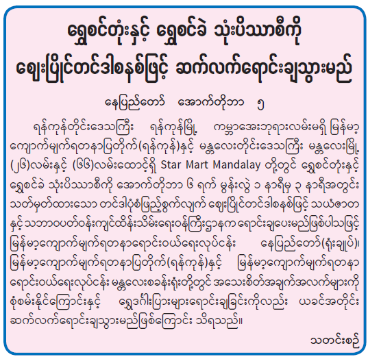 ရွှေစင်တုံးနှင့် ရွှေစင်ခဲ သုံးပိဿာစီကို ဈေးပြိုင်တင်ဒါစနစ်ဖြင့် ဆက်လက်ရောင်းချသွားမည်