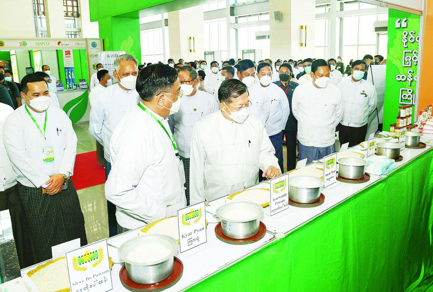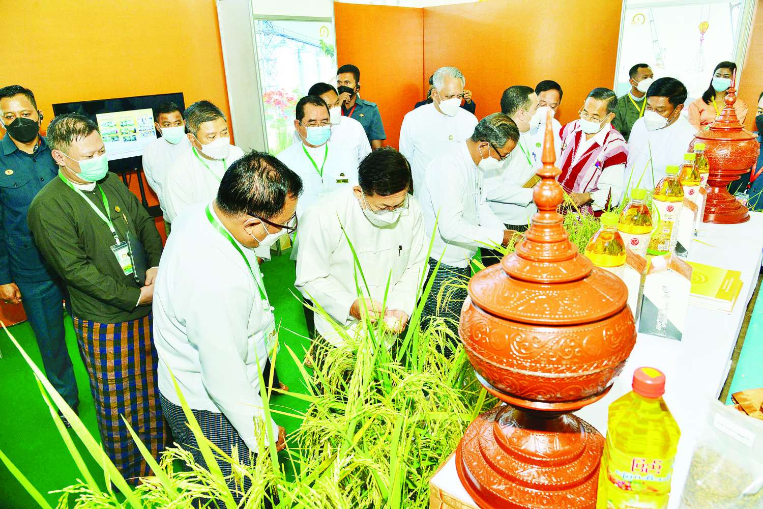 ယင်းနောက် မြန်မာနိုင်ငံ ဆန်စပါးအထူးပြု ပြခန်းများအတွင်း မြန်မာနိုင်ငံမှထွက်ရှိသည့် ဆန်၊ စပါးများနှင့် မြေဩဇာများ ပြသထားရှိမှုကို လှည့်လည်ကြည့်ရှု အားပေးခဲ့သည်။