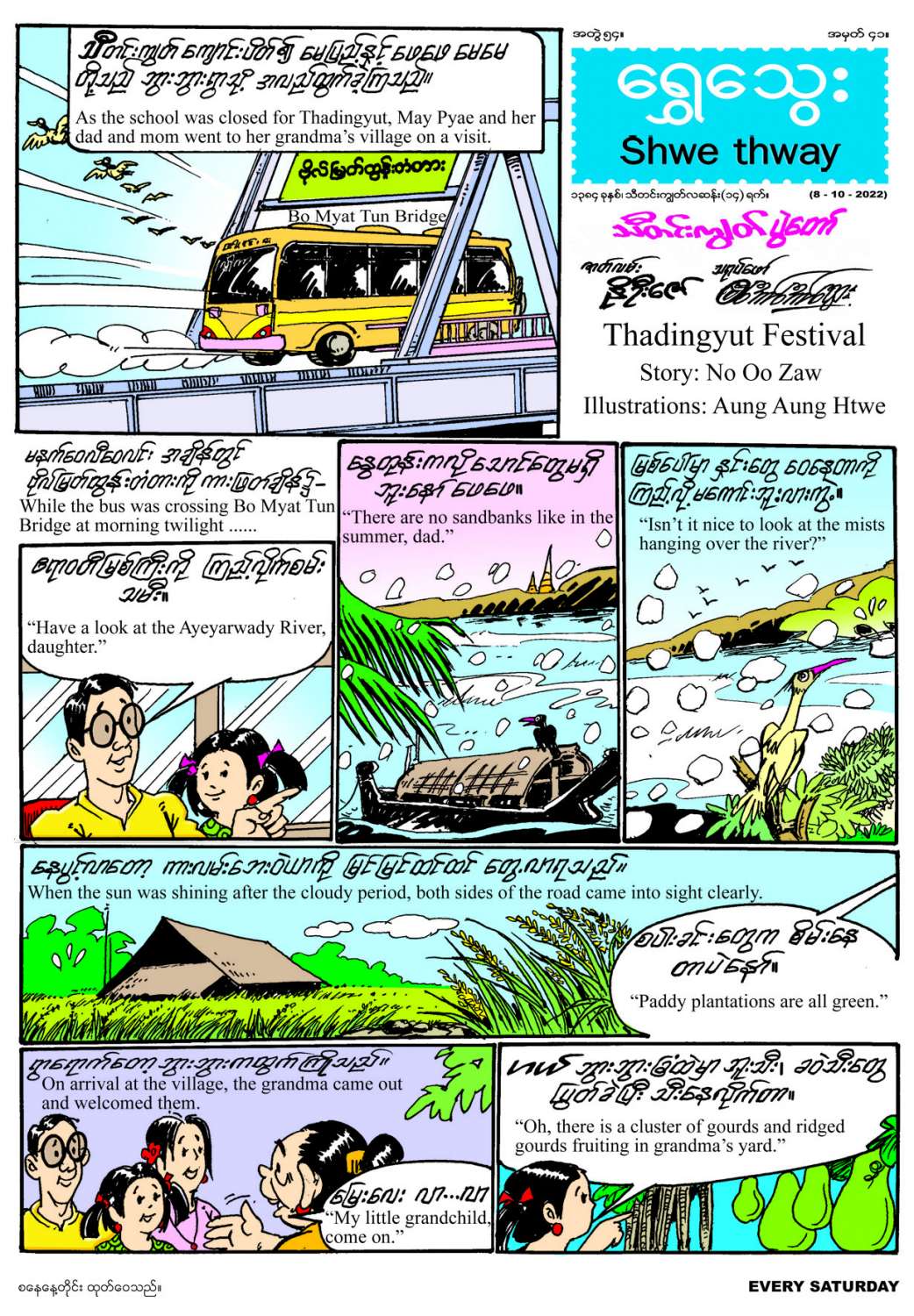 ၈-၁၀-၂၀၂၂ ရက် (စနေနေ့) တွင် ထွက်ရှိမည့် ရွှေသွေးဂျာနယ် အတွဲ (၅၄)၊ အမှတ် (၄၁) တွင် သီတင်းကျွတ်ကျောင်းပိတ်ရက်တွင် ဘွားဘွားရှိရာ ကျေးရွာလေးသို့ အလည်အပတ်သွားရောက်ခဲ့သော မေပြည့်၏အတွေ့အကြုံများနှင့် သီတင်းကျွတ်မီးထွန်းပွဲတော်အကြောင်းကို သရုပ်ဖော်တင်ဆက်ထားသည့် “သီတင်းကျွတ်ပွဲတော်” မျက်နှာဖုံးကာတွန်း၊ သီတင်းကျွတ်ပွဲတော်အကြောင်းနှင့် ပွဲတော်ဖြစ်ပေါ်လာပုံ၊ ဆီမီးပူဇော်ပုံတို့အကြောင်းကို ဗဟုသုတရဖွယ် တင်ဆက်ထားသည့် “ဝါလကင်းလွတ်သီတင်းကျွတ်” သုတဆောင်းပါး၊ သီတင်း ကျွတ်လပြည့်နေ့၌ မိဘများကို မိမိစုထားသည့် မုန့်ဖိုးများနှင့် မုန့်များဝယ်ကာ ကန်တော့ရ၍ ဝမ်းမြောက်ဝမ်းသာဖြစ်နေသော လင်းသစ်အကြောင်းကို တင်ဆက်ထားသည့် “လင်းသစ်၏ဝါလကင်းလွတ် သီတင်းကျွတ်” နှစ်မျက်နှာကာတွန်း။