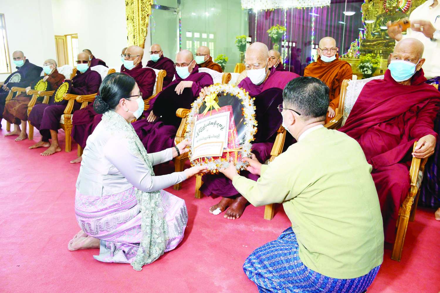 ဆက်လက်၍ ရခိုင်ပြည်နယ်ဝန်ကြီးချုပ် ဒေါက်တာ အောင်ကျော်မင်းက သာသနာရေးဆိုင်ရာများ လျှောက်ထားပြီး နိုင်ငံတော်စီမံအုပ်ချုပ်ရေး ကောင်စီဝင် ဒေါ်အေးနုစိန်၊ ပြည်နယ်ဝန်ကြီးချုပ်၊ တိုင်းမှူးနှင့် တာဝန်ရှိသူများက သံဃာတော်အရှင်သူမြတ်များအား လှူဖွယ်ဝတ္ထုများ ဆက်ကပ်လှူဒါန်းကြသည်။