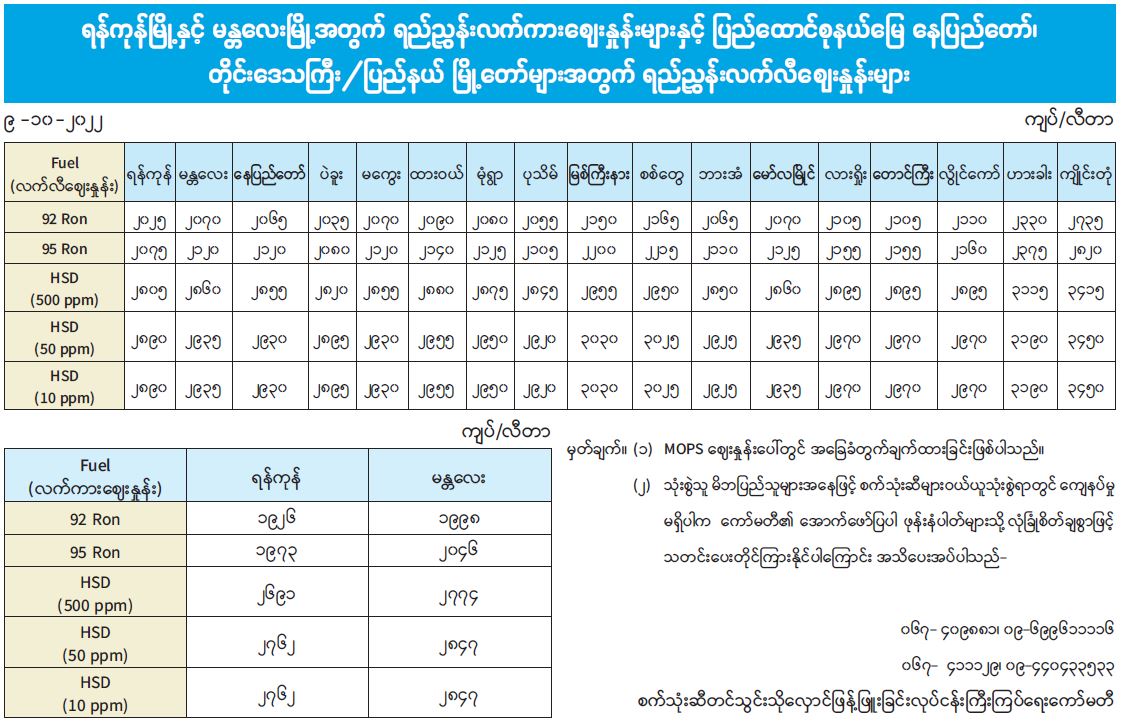 ရန်ကုန်မြို့နှင့် မန္တလေးမြို့အတွက် ရည်ညွှန်းလက်ကားဈေးနှုန်းများနှင့် ပြည်ထောင်စုနယ်မြေ နေပြည်တော်၊ တိုင်းဒေသကြီး/ပြည်နယ် မြို့တော်များအတွက် ရည်ညွှန်းလက်လီဈေးနှုန်းများ 10/09/2022