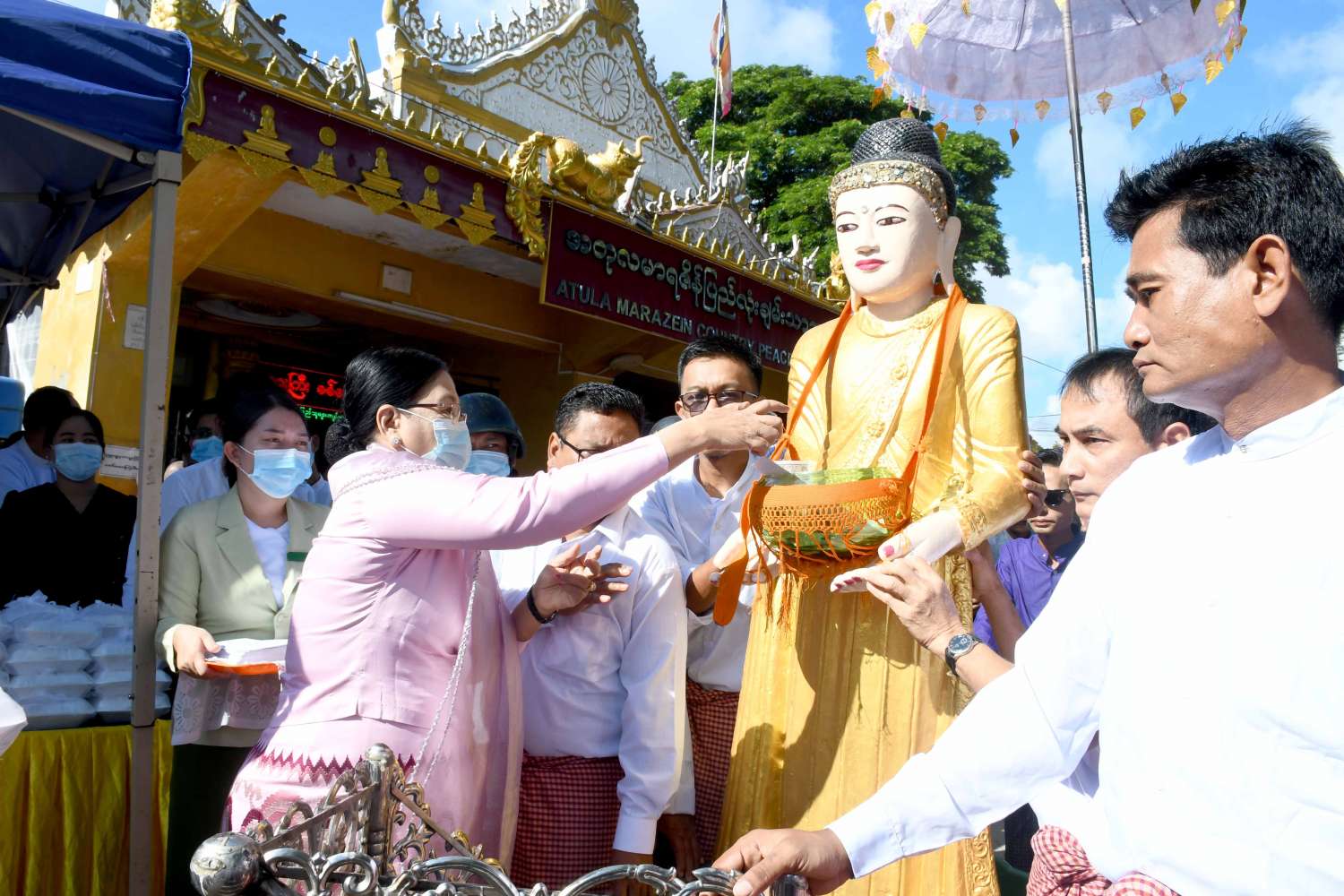 ဦးစွာ နိုင်ငံတော် စီမံအုပ်ချုပ်ရေး ကောင်စီဝင် ဒေါ်အေးနုစိန်သည် ပြည်နယ်ဝန်ကြီးချုပ်၊ ပြည်နယ်အစိုးရ အဖွဲ့ဝင်များနှင့်အတူ အတုလမာရဇိန် ပြည်လုံးချမ်းသာ ဘုရားကြီးအား ဖူးမြော်ကြည်ညိုပြီး ပန်း၊ ဆီမီးများ ဆက်ကပ်လှူဒါန်းကြသည်။