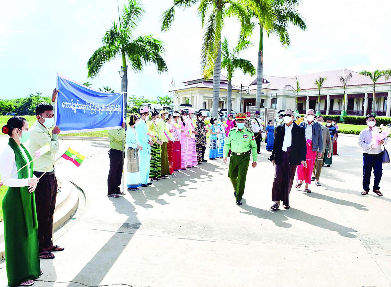တစ်နိုင်ငံလုံး ထာဝရငြိမ်းချမ်းရေး ရရှိရန်နှင့် လက်နက်ကိုင် ပဋိပက္ခ ချုပ်ငြိမ်းရေးတို့အတွက် ရည်ရွယ်၍ နိုင်ငံတော် စီမံအုပ်ချုပ်ရေး ကောင်စီဥက္ကဋ္ဌ၊ နိုင်ငံတော်ဝန်ကြီးချုပ်၊ တပ်မတော် ကာကွယ်ရေး ဦးစီးချုပ် ဗိုလ်ချုပ်မှူးကြီး မင်းအောင်လှိုင်၏ ငြိမ်းချမ်းရေး ဆွေးနွေးရန် ဖိတ်ခေါ်ချက်အရ မွန်ပြည်သစ်ပါတီ (NMSP) ဒုတိယဥက္ကဋ္ဌ နိုင်အောင်မင်း ဦးဆောင်သည့် ငြိမ်းချမ်းရေး ကိုယ်စားလှယ်အဖွဲ့သည် ယနေ့မွန်းလွဲပိုင်းတွင် နေပြည်တော်ရှိ Horizon Lake View Resort သို့ မော်တော်ယာဉ်များဖြင့် ရောက်ရှိကြရာ အမျိုးသားစည်းလုံး ညီညွတ်ရေးနှင့် ငြိမ်းချမ်းရေး ဖော်ဆောင်မှု ညှိနှိုင်းရေး ကော်မတီအဖွဲ့ဝင်နှင့် တာဝန်ရှိသူများ၊ နေပြည်တော် ကောင်စီနှင့် ဝန်ကြီးဌာနများမှ တာဝန်ရှိသူများ၊ သာသနာရေးနှင့် ယဉ်ကျေးမှု ဝန်ကြီးဌာန၊ အနုပညာဦးစီးဌာနမှ တိုင်းရင်းသား တိုင်းရင်းသူများ၊ ဌာနဆိုင်ရာ ဝန်ထမ်းများ၊ ငြိမ်းချမ်းရေးကို လိုလားသည့် ဒေသခံပြည်သူများက ထာဝရငြိမ်းချမ်းရေးကို ရရှိရေးသည် ပြည်သူတစ်ရပ်လုံး၏ ဆန္ဒအစစ်အမှန်ဖြစ်သည်၊ ငြိမ်းချမ်းရေး ရရှိရေးသည် နိုင်ငံသား အားလုံး၏ ဆန္ဒအမှန် ဖြစ်သည်၊ ပြည်ထောင်စုကြီး ငြိမ်းချမ်းဖို့ တွေ့ဆုံ ဆွေးနွေးကြပါစို့၊ တိုင်းရင်းသားတွေ စည်းလုံးမှ ငြိမ်းချမ်းတည်ငြိမ် အေးချမ်းရ စသည့် မွန်ဘာသာနှင့် မြန်မာဘာသာ စာသားပါ ဆိုင်းဘုတ်များ ကိုင်ဆောင်၍ လည်းကောင်း၊ နိုင်ငံတော် အလံငယ်များ ကိုင်ဆောင်၍ လည်းကောင်း ကြိုဆိုခဲ့ကြသည်။