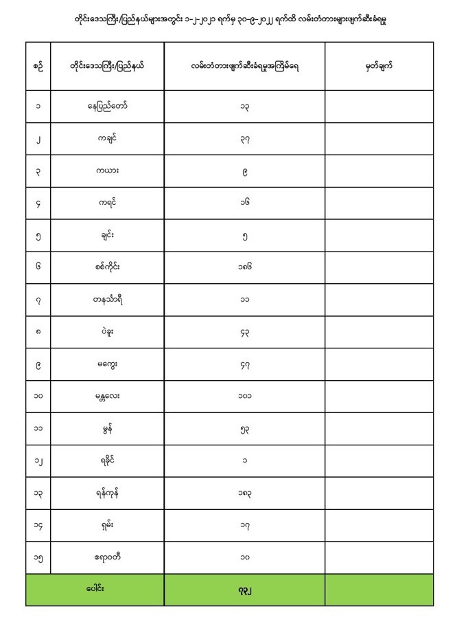 ထိုသို့ အကြမ်းဖက်အဖွဲ့များက မိုင်းထောင်ဖောက်ခွဲ၊ မီးရှို့ဖျက်ဆီးခြင်း စသည့် အကြမ်းဖက်လုပ်ရပ်များ လုပ်ဆောင်ခဲ့ရာ ယနေ့အထိ ၇၃၂ ကြိမ်လုပ် ဆောင်ခဲ့မှုကို ဖော်ပြပါအတိုင်း တွေ့ရှိရသည်-