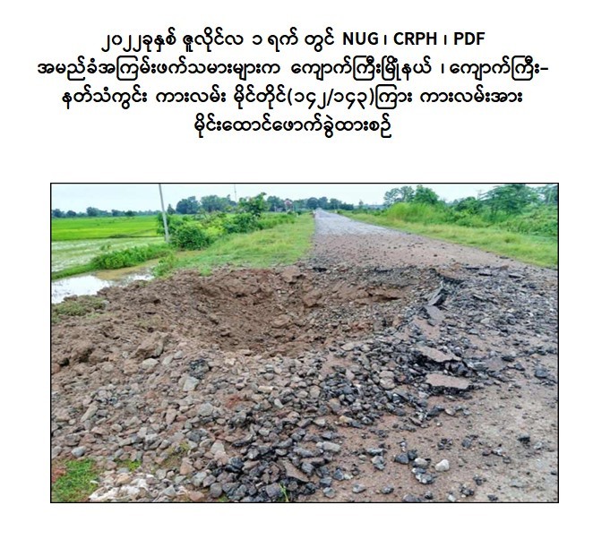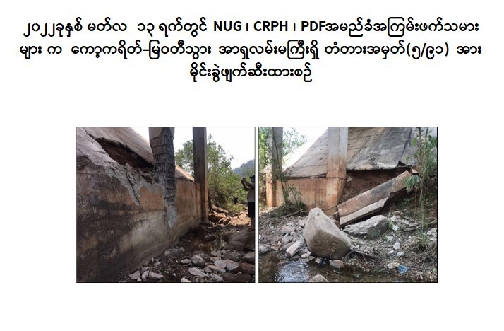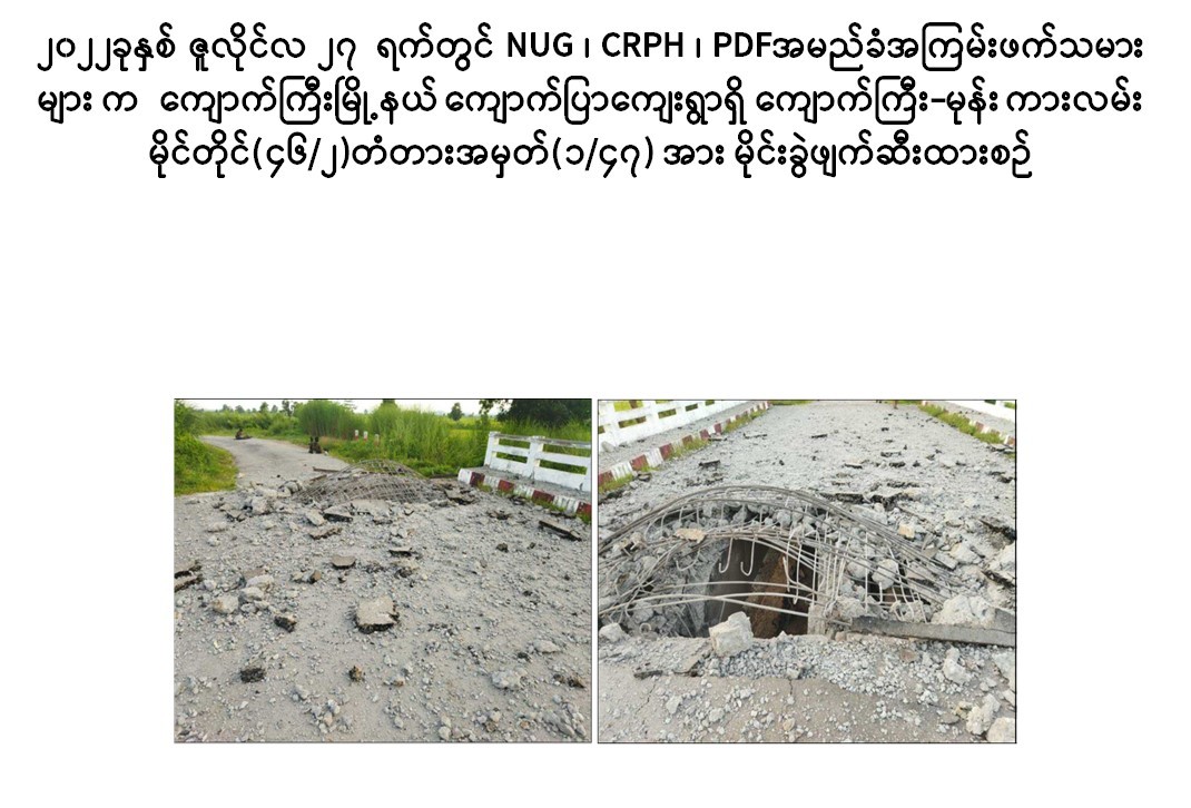ထို့ပြင် ဒေသတွင်းဖွံ့ဖြိုး တိုးတက်ရေး၊ လမ်းပန်းဆက်သွယ် လွယ်ကူချောမွေ့စေရေး တို့အတွက် အစိုးရအဆက်ဆက် နိုင်ငံတော်ဘဏ္ဍာငွေများ အမြောက်အများ အသုံးပြုပြီး အချိန်ကာလကြာရှည်စွာ တည်ဆောက်ထားသည့် လမ်း၊ တံတားများကို PDF အမည်ခံ အကြမ်းဖက်သမားများက မိုင်းထောင်ဖောက်ခွဲ၊ မီးရှို့ ဖျက်ဆီးခြင်းများကို လုပ်ဆောင်လျက်ရှိသည်။