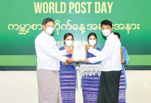 ယင်းနောက် ကမ္ဘာ့စာပို့တိုက်နေ့အထိမ်းအမှတ် အခမ်းအနားတွင် (၅၁) ကြိမ်မြောက် အသက် (၁၅) နှစ်နှင့်အောက် နိုင်ငံတကာ လူငယ်များ ပေးစာရေးပြိုင်ပွဲ (ပြည်တွင်းအဆင့်) ၌ ပထမဆုရရှိသော နေပြည်တော် ပြည်ထောင်စုနယ်မြေ ဇမ္ဗူသီရိမြို့နယ်မှ မောင်မိုးထက်အောင်၊ (ဝဲပုံ) ဒုတိယဆုရရှိသော နေပြည်တော်ပြည်ထောင်စုနယ်မြေ ပျဉ်းမနားမြို့မှ မသက်မှူးခင်၊ တတိယဆုရရှိသော မကွေးတိုင်းဒေသကြီး မကွေးမြို့မှ မခင်ခင်ဦးသာနှင့် အထူးဆုရရှိသူ နှစ်ဦးတို့ကို ပြည်ထောင်စုဝန်ကြီးက ဂုဏ်ပြုဆုများ ပေးအပ်ချီးမြှင့်သည်။