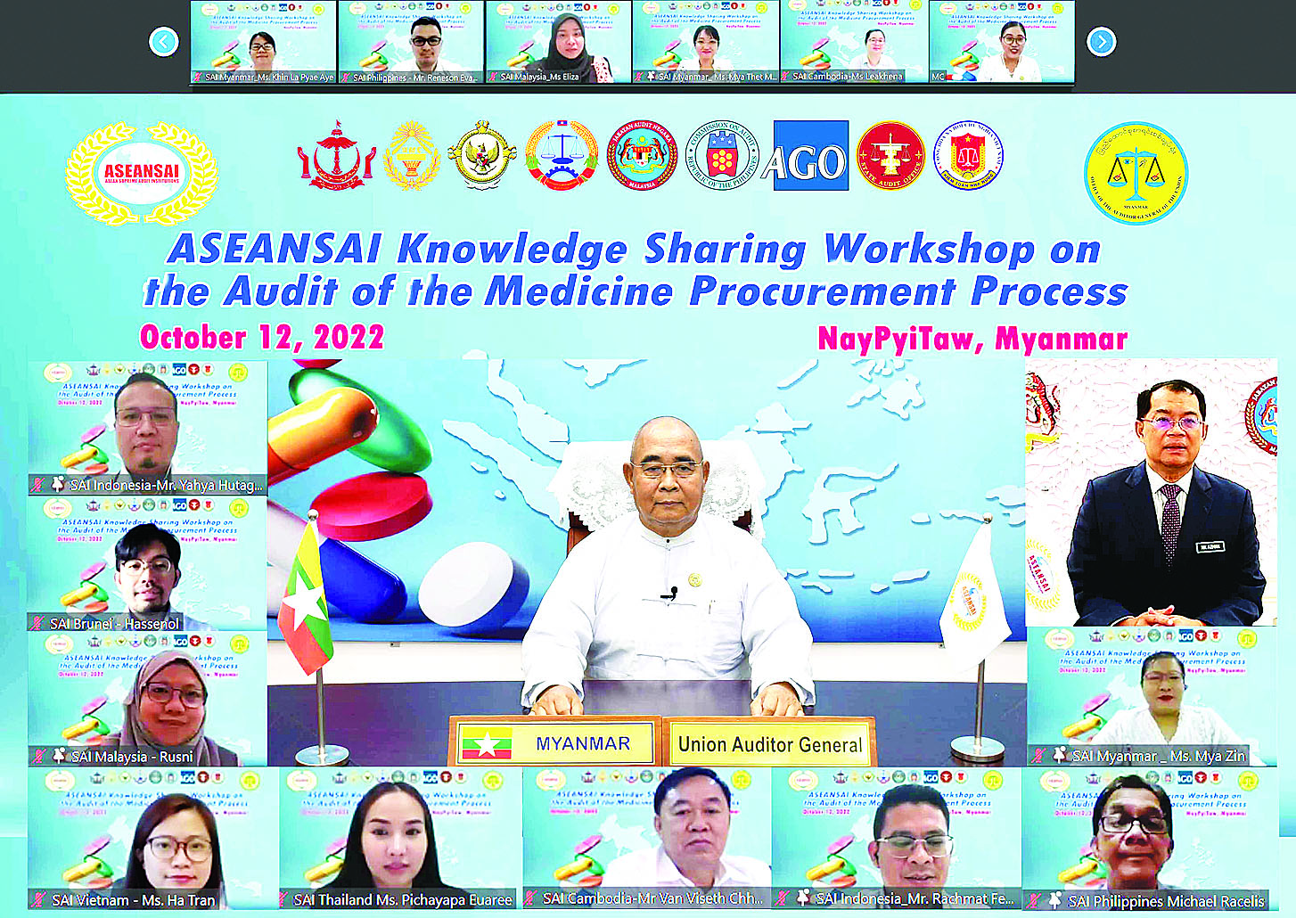 အရှေ့တောင်အာရှ နိုင်ငံများဆိုင်ရာ စာရင်းစစ်ချုပ်ရုံးများအဖွဲ့ (ASEANSAI) ၏ အသိပညာမျှဝေမှု အစီအစဉ်အရ ဆေးဝါးဝယ်ယူ ဖြန့်ဖြူးမှုလုပ်ငန်းစဉ် စစ်ဆေးခြင်း နှင့်စပ်လျဉ်းသည့် အသိပညာမျှဝေမှု အလုပ်ရုံဆွေးနွေးပွဲကို ယနေ့မွန်းလွဲပိုင်းတွင် နေပြည်တော်ရှိ ပြည်ထောင်စု စာရင်းစစ်ချုပ်ရုံး အစည်းအဝေးခန်းမ၌ ကိုဗစ် - ၁၉ ရောဂါ ကာကွယ်ရေး စည်းမျဉ်း စည်းကမ်းများနှင့်အညီ ဗီဒီယိုကွန်ဖရင့်စနစ်ဖြင့် ကျင်းပသည်။