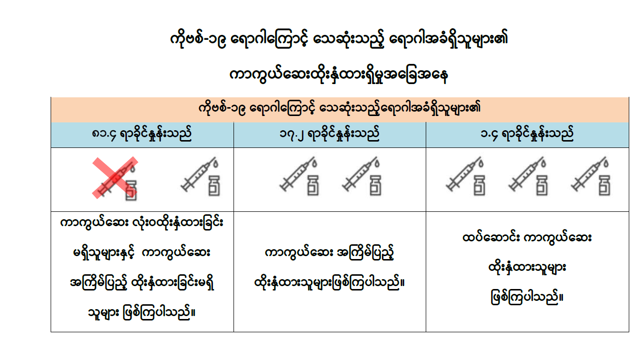 သို့ဖြစ်ပါ၍ ကိုဗစ်-၁၉ ရောဂါကူးစက်ခံရပါက အသက်အန္တရာယ်ဆုံးရှုံးနိုင်ခြေ ပိုမိုများပြားသည့် ဆီးချို၊ သွေးတိုး၊ နှလုံး၊ အသည်း၊ ကျောက်ကပ်၊ အဆုတ်၊ ကင်ဆာရောဂါ စသည့် နာတာရှည် ရောဂါအခံတစ်ခုခု ရှိသူများအနေဖြင့် ကိုဗစ်-၁၉ ရောဂါ ကာကွယ်ဆေးထိုးနှံမှုကို မပျက်မကွက် ခံယူကြပါရန်နှင့် ၎င်းတို့၏မိသားစုဝင်များ၊ မိတ်ဆွေများမှလည်း အဆိုပါ နာတာရှည်ရောဂါအခံ တစ်ခုခုရှိသူများအနေဖြင့် ကိုဗစ်-၁၉ ရောဂါကာကွယ်ဆေးထိုးနှံမှုများကို အကြိမ်ပြည့် ထိုးနှံမှုခံယူရေးနှင့် ထပ်ဆောင်းကာကွယ်ဆေးများကို မပျက်မကွက် ထိုးနှံမှုခံယူနိုင်ရေးအတွက် နီးစပ်ရာ ကာကွယ်ဆေးထိုးစုရပ်များ၊ ကျန်းမာရေးဌာနများ၊ ရပ်ကွက်/ ကျေးရွာ အုပ်ချုပ်ရေးမှူးရုံးများနှင့် မပျက်မကွက် ဆက်သွယ်ဆောင်ရွက်ကြပါရန် တိုက်တွန်းအပ်ပါသည်။