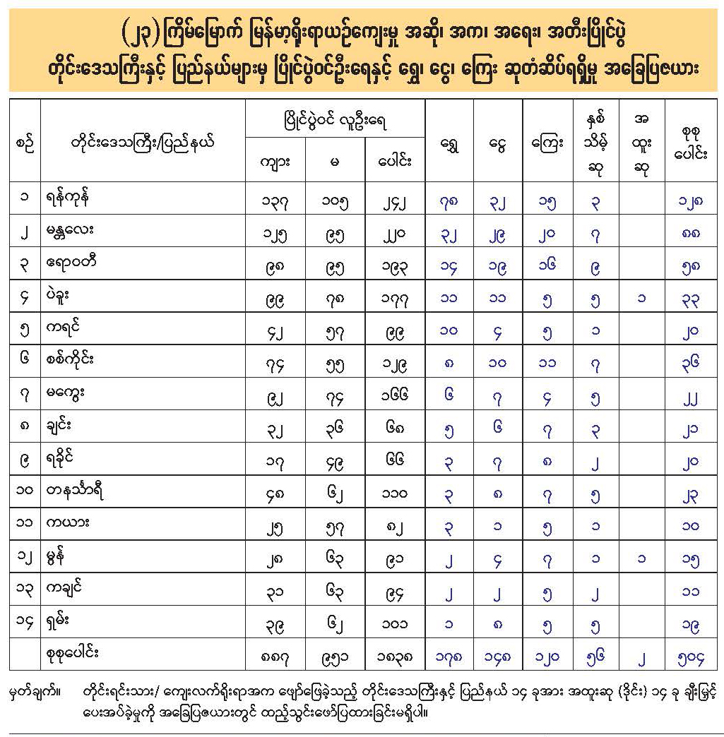 (၂၃)ကြိမ်မြောက် မြန်မာ့ရိုးရာယဉ်ကျေးမှု အဆို၊ အက၊ အရေး၊ အတီးပြိုင်ပွဲ တိုင်းဒေသကြီးနှင့် ပြည်နယ်များမှ ပြိုင်ပွဲဝင်ဦးရေနှင့် ရွှေ၊ ငွေ၊ ကြေး၊ ဆုတံဆိပ် ရရှိမှု အခြေပြဇယား 10/18/2022