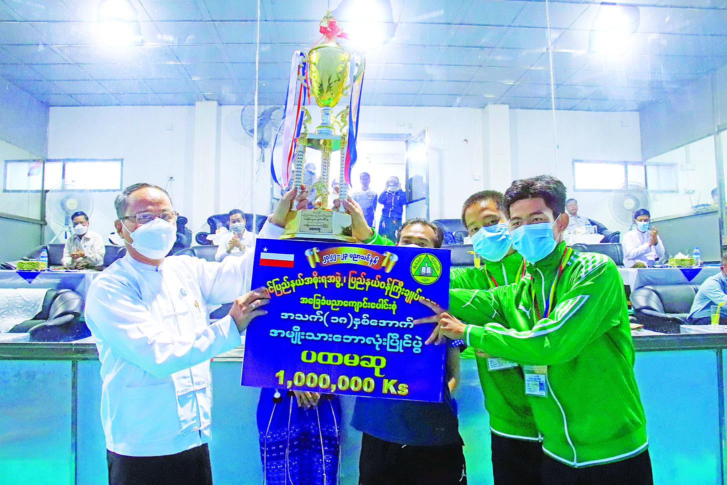 ဗိုလ်လုပွဲစဉ်အပြီးတွင် ဆုချီးမြှင့်ပွဲအခမ်းအနားကို ဆက်လက်ကျင်းပရာ ပြည်နယ်ပညာရေးမှူးရုံးမှ ညွှန်ကြားရေးမှူး ဒေါ်နန့်စယ်လီလှိုင်၊ ဒုတိယညွှန် ကြားရေးမှူးများ၊ လက်ထောက် ညွှန်ကြားရေးမှူးနှင့် ပြည်နယ်အဆင့် ဌာနဆိုင်ရာများက ကြက်ခြေနီတပ်ဖွဲ့နှင့် ဒိုင်အဖွဲ့တို့ကို ဂုဏ်ပြုဆုငွေများ၊ အမျိုးသား/ အမျိုးသမီး နေရာအလိုက် အကောင်းဆုံး အားကစားသမားဆုများ၊ ပွဲစဉ်တစ်လျှောက် အကောင်းဆုံး အားကစားသမား ဆုများကိုလည်းကောင်း၊ ပြည်နယ်အစိုးရအဖွဲ့ဝင်များက ပထမ၊ ဒုတိယနှင့် ပူးတွဲတတိယဆု ရရှိကြသော အမျိုးသား/ အမျိုးသမီး ဘောလုံးအသင်းများကို ငွေသားဆုများနှင့် ဆုဖလားများကိုလည်းကောင်း၊ ပြည်နယ်တရားလွှတ်တော် တရားသူကြီးချုပ် ဒေါ်ခင်ဆွေထွန်းက ပထမဆုရရှိသည့် ဘားအံမြို့နယ် အမျိုးသမီး ဘောလုံးအသင်းအား ငွေသားဆုငွေကျပ် ၁၀ သိန်းနှင့် တံခွန်စိုက် ဆုဖလားတို့ကို လည်းကောင်း ပေးအပ်ချီးမြှင့်ပြီး ပြည်နယ်ဝန်ကြီးချုပ် ဦးစောမြင့်ဦးက ပထမဆုရရှိသော မြဝတီမြို့နယ် အမျိုးသားဘောလုံးအသင်းအား ငွေသားဆုငွေကျပ် ၁၀ သိန်းနှင့် တံခွန်စိုက်ဆုဖလားတို့ကို ပေးအပ်ချီးမြှင့်ခဲ့ကြောင်း သိရသည်။