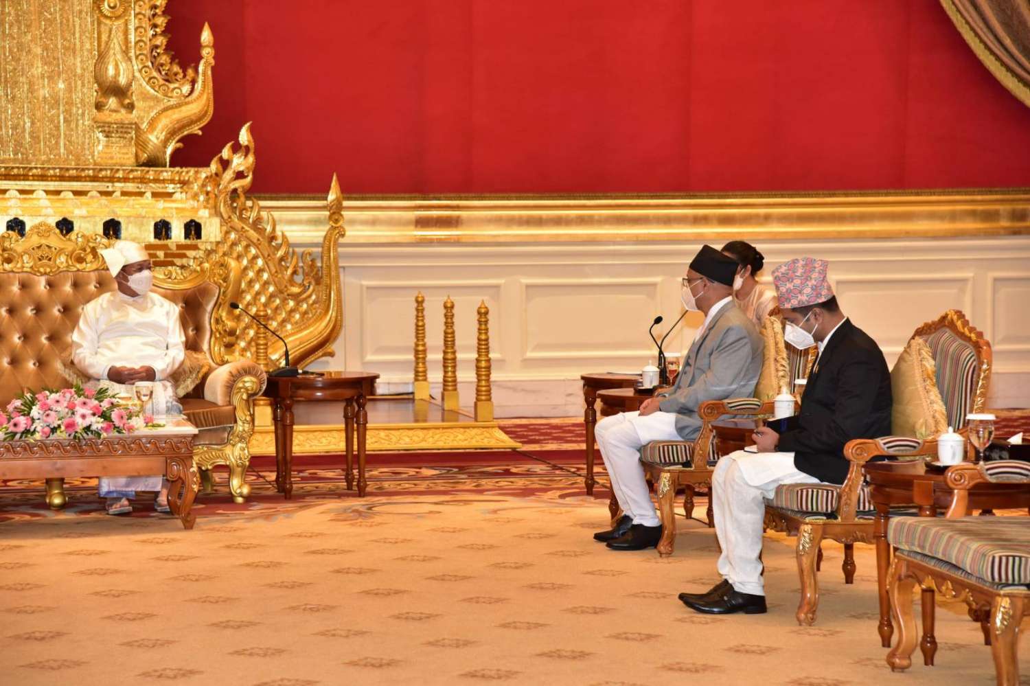 တွေ့ဆုံပွဲအပြီးတွင် နိုင်ငံတော်စီမံအုပ်ချုပ်ရေးကောင်စီဥက္ကဋ္ဌ နိုင်ငံတော်ဝန်ကြီးချုပ်နှင့် မြန်မာနိုင်ငံဆိုင်ရာ နီပေါနိုင်ငံသံအမတ်ကြီးတို့သည် စုပေါင်းမှတ်တမ်းတင် ဓာတ်ပုံရိုက်ကြသည်။