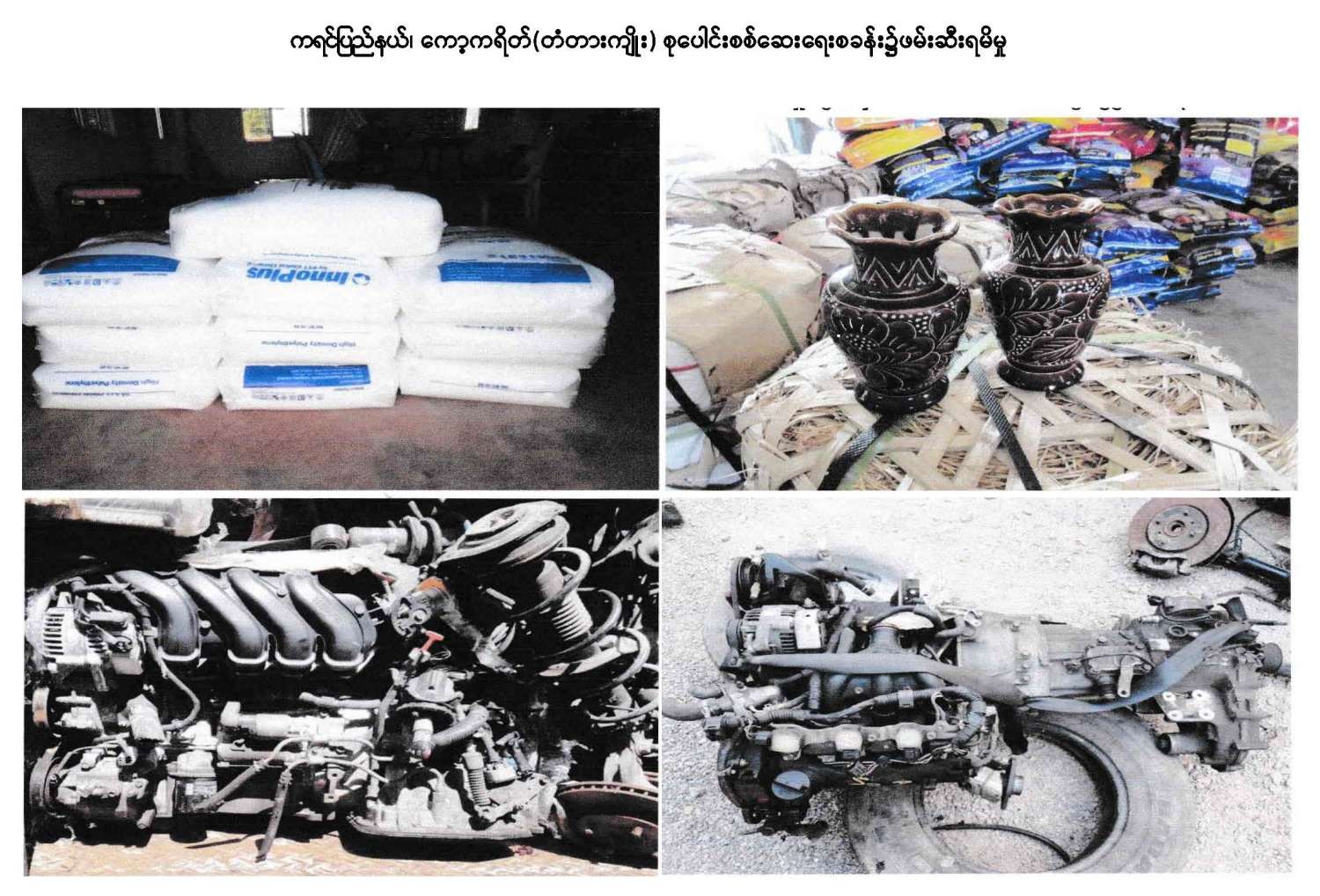 ထို့ပြင် နိုဝင်ဘာ ၁၀ ရက်တွင် ကရင်ပြည်နယ်တရားမဝင်ကုန်သွယ်မှုတိုက်ဖျက်ရေး အထူးအဖွဲ့၏ စီမံခန့်ခွဲမှုဖြင့် ကော့ကရိတ်(တံတားကျိုး) စုပေါင်းစစ်ဆေးရေးစခန်း၌ တာဝန်ကျပူးပေါင်းအဖွဲ့က စစ်ဆေးမှုများ ဆောင်ရွက်ခဲ့ရာ တရားဝင်စာရွက်စာတမ်း အထောက်အထား တင်ပြနိုင်ခြင်းမရှိသည့် ဘုရားပန်းအိုးများ၊ Plastic Resin များ၊ မော်တော်ကားအင်ဂျင်များ (ခန့်မှန်းတန်ဖိုးငွေကျပ် ၁၉,၈၁၈,၇၅၀)နှင့် အဆိုပါပစ္စည်းများ တင်ဆောင်လာသည့် နောက်တွဲယာဉ်(၁)တွဲနှင့် Mitsubishi Fuso အမျိုးအစား မော်တော်ယာဉ်(၁)စီး (ခန့်မှန်းတန်ဖိုးငွေကျပ် ၈၀,၀၀၀,၀၀၀) စုစုပေါင်း (ခန့်မှန်းတန်ဖိုးငွေကျပ် ၉၉,၈၁၈,၇၅၀)ကို ဖမ်းဆီးရမိခဲ့ပြီး အကောက်ခွန်လုပ်ထုံးလုပ်နည်းနှင့်အညီ အရေးယူဆောင်ရွက် လျက်ရှိသည်။