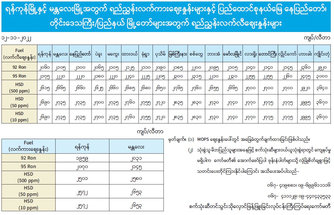 ရန်ကုန်မြို့နှင့် မန္တလေးမြို့အတွက် ရည်ညွှန်းလက်ကားဈေးနှုန်းများနှင့် ပြည်ထောင်စုနယ်မြေ နေပြည်တော် တိုင်းဒေသကြီး/ပြည်နယ် မြို့တောင်များအတွက် ရည်ညွှန်းလက်လီဈေးနှုန်းများ