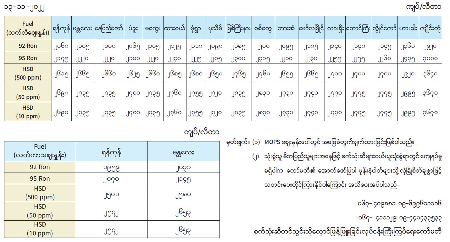 ရန်ကုန်မြို့နှင့် မန္တလေးမြို့အတွက် ရည်ညွှန်းလက်ကားဈေးနှုန်းများနှင့် ပြည်ထောင်စုနယ်မြေ နေပြည်တော် တိုင်းဒေသကြီး/ပြည်နယ် မြို့တောင်များအတွက် ရည်ညွှန်းလက်လီဈေးနှုန်းများ 11/13/2022