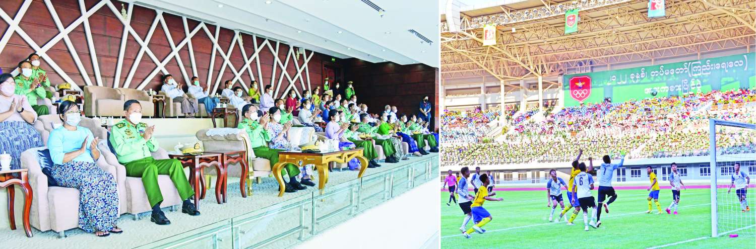 ထို့နောက် နိုင်ငံတော်စီမံအုပ်ချုပ်ရေးကောင်စီဥက္ကဋ္ဌ တပ်မတော်ကာကွယ်ရေးဦးစီးချုပ်နှင့် အခမ်းအနားတက်ရောက်လာကြသူများသည် တပ်မတော်ကာကွယ်ရေး ဦးစီးချုပ်ဖလား (က) အဆင့် ဘောလုံးပြိုင်ပွဲပထမအကြိုဗိုလ်လုပွဲအဖြစ် အရှေ့ပိုင်းတိုင်းစစ်ဌာနချုပ် ကိုယ်စားပြုအသင်းနှင့် အလယ်ပိုင်းတိုင်းစစ်ဌာနချုပ် ကိုယ်စားပြုအသင်းတို့ ယှဉ်ပြိုင်ကစားနေမှုအား ကြည့်ရှုအားပေးကြသည်။