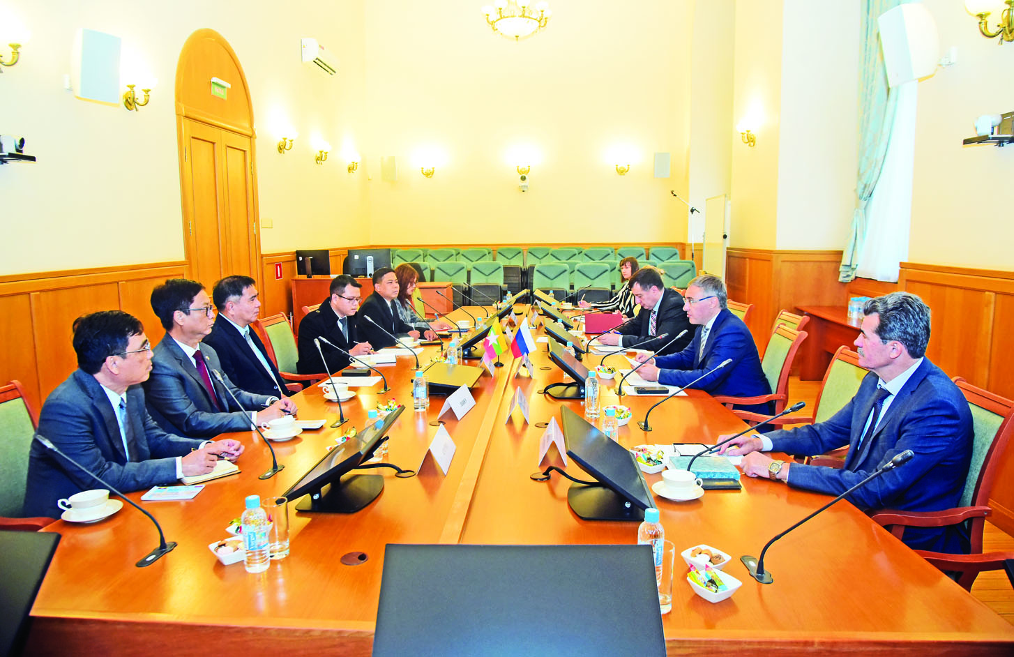ရုရှားဖက်ဒရေးရှင်းနိုင်ငံ၌ ကျင်းပပြုလုပ်မည့် သုတေသနလေ့လာရေးခရီးစဉ်နှင့် (၁၂)ကြိမ်မြောက် နျူကလီးယားနည်းပညာအခြေခံသည့် ဆန်းသစ်တီထွင်မှုဖိုရမ် (၂၀၂၂)တက်ရောက်ရန် ရုရှားဖက်ဒရေးရှင်းနိုင်ငံတွင် ရောက်ရှိနေသည့် သိပ္ပံနှင့်နည်းပညာဝန်ကြီးဌာန ပြည်ထောင်စုဝန်ကြီး ဒေါက်တာမျိုးသိန်းကျော် ဦးဆောင်သည့် မြန်မာကိုယ်စားလှယ်အဖွဲ့သည် ရုရှားဖက်ဒရေးရှင်းနိုင်ငံဆိုင်ရာ မြန်မာ သံအမတ်ကြီး ဦးလွင်ဦး၊ တာဝန်ရှိသူများနှင့်အတူ နိုဝင်ဘာ ၁၄ ရက်နံနက်ပိုင်းတွင် မော်စကိုမြို့ရှိ ရုရှားဖက်ဒရေးရှင်းနိုင်ငံ သိပ္ပံနှင့်အဆင့်မြင့်ပညာဝန်ကြီးဌာနဝန်ကြီး H.E . Valery Falkov အား အဆိုပါဝန်ကြီးဌာန အစည်းအဝေးခန်းမ၌ သွားရောက်တွေ့ဆုံသည်။