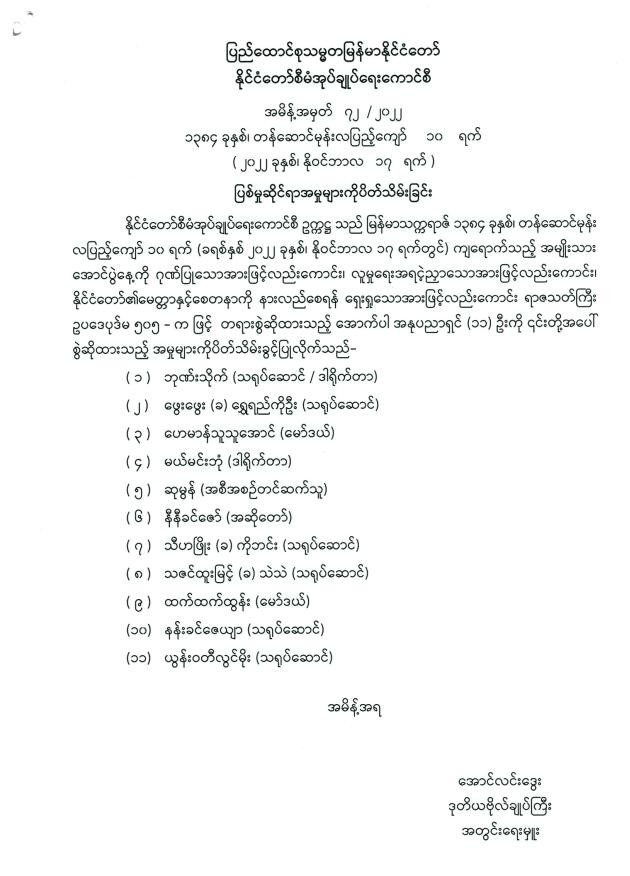 တိုင်းဒေသကြီးလွှတ်တော် သို့မဟုတ် ပြည်နယ်လွှတ်တော် ကိုယ်စားလှယ်အစားထိုး ဖြည့်စွက်ကြောင်းကြေညာခြင်း