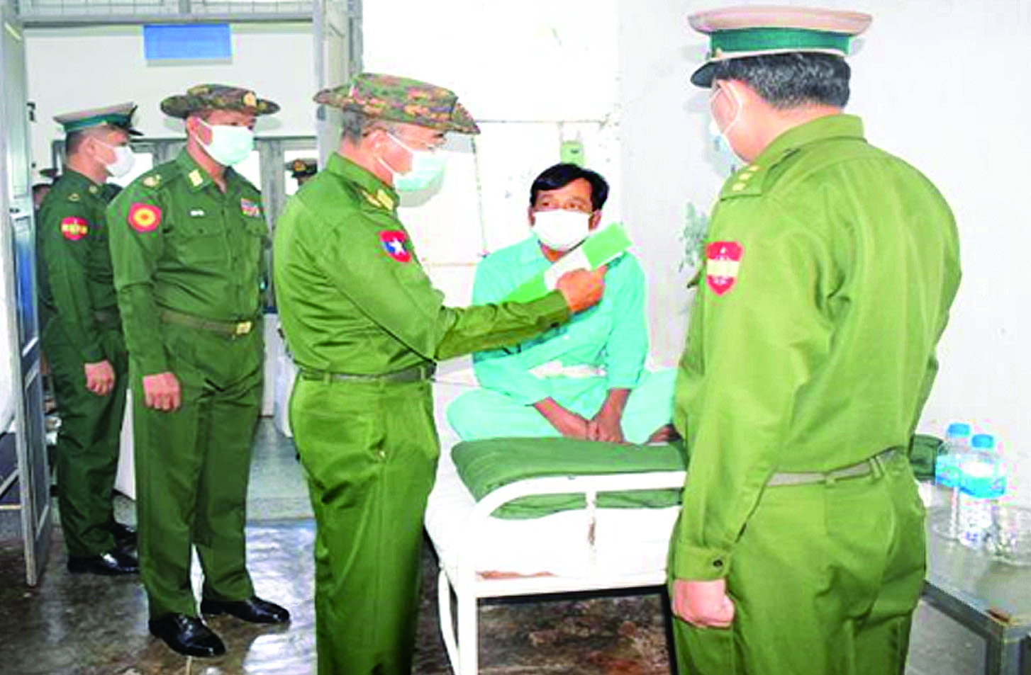 အလားတူ ရှမ်းပြည်နယ်(အရှေ့ပိုင်း) ကျိုင်းတုံမြို့နှင့် မိုင်းဆတ်မြို့တို့ရှိ တပ်မတော်ဆေးရုံ၊ ဧရာဝတီတိုင်းဒေသကြီး ပုသိမ်မြို့ရှိ နယ်မြေခံဆေးတပ်ရင်းနှင့် ပဲခူးတိုင်းဒေသကြီး တောင်ငူမြို့ရှိ တပ်မတော်ဆေးရုံတို့၌ တက်ရောက်ဆေးကုသမှု ခံယူနေသူများအား ယနေ့တွင် သက်ဆိုင်ရာ တိုင်းစစ်ဌာနချုပ်များမှ တိုင်းမှူးများနှင့် တာဝန်ရှိသူများက သွားရောက်ကြည့်ရှု၍ တစ်ဦးချင်း၏ ရောဂါဖြစ်ပွားမှု၊ ဆေးဝါးကုသပေးထားမှုနှင့် ကျန်းမာရေးတိုးတက်ကောင်းမွန်မှု အခြေအနေများအား မေးမြန်းအားပေးစကား ပြောကြားပြီး စားသောက်ဖွယ်ရာများ ပေးအပ်ကာ ဆေးရုံများအတွင်း လှည့်လည်ကြည့်ရှု၍ လိုအပ်သည်များ ညှိနှိုင်းဆောင်ရွက်ပေးခဲ့ကြကြောင်း သတင်းရရှိသည်။