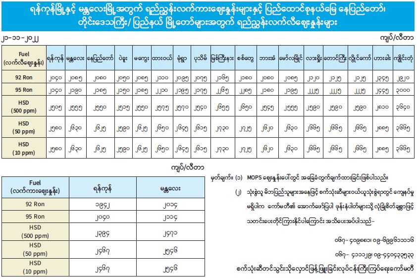 ရန်ကုန်မြို့နှင့် မန္တလေးမြို့အတွက် ရည်ညွှန်းလက်ကားဈေးနှုန်းများနှင့် ပြည်ထောင်စုနယ်မြေ နေပြည်တော်၊ တိုင်းဒေသကြီး/ ပြည်နယ် မြို့တော်များအတွက် ရည်ညွှန်းလက်လီဈေးနှုန်းများ 11/21/2022