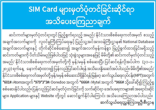 SIM Card များမှတ်ပုံတင်ခြင်းဆိုင်ရာ အသိပေးကြေညာချက်