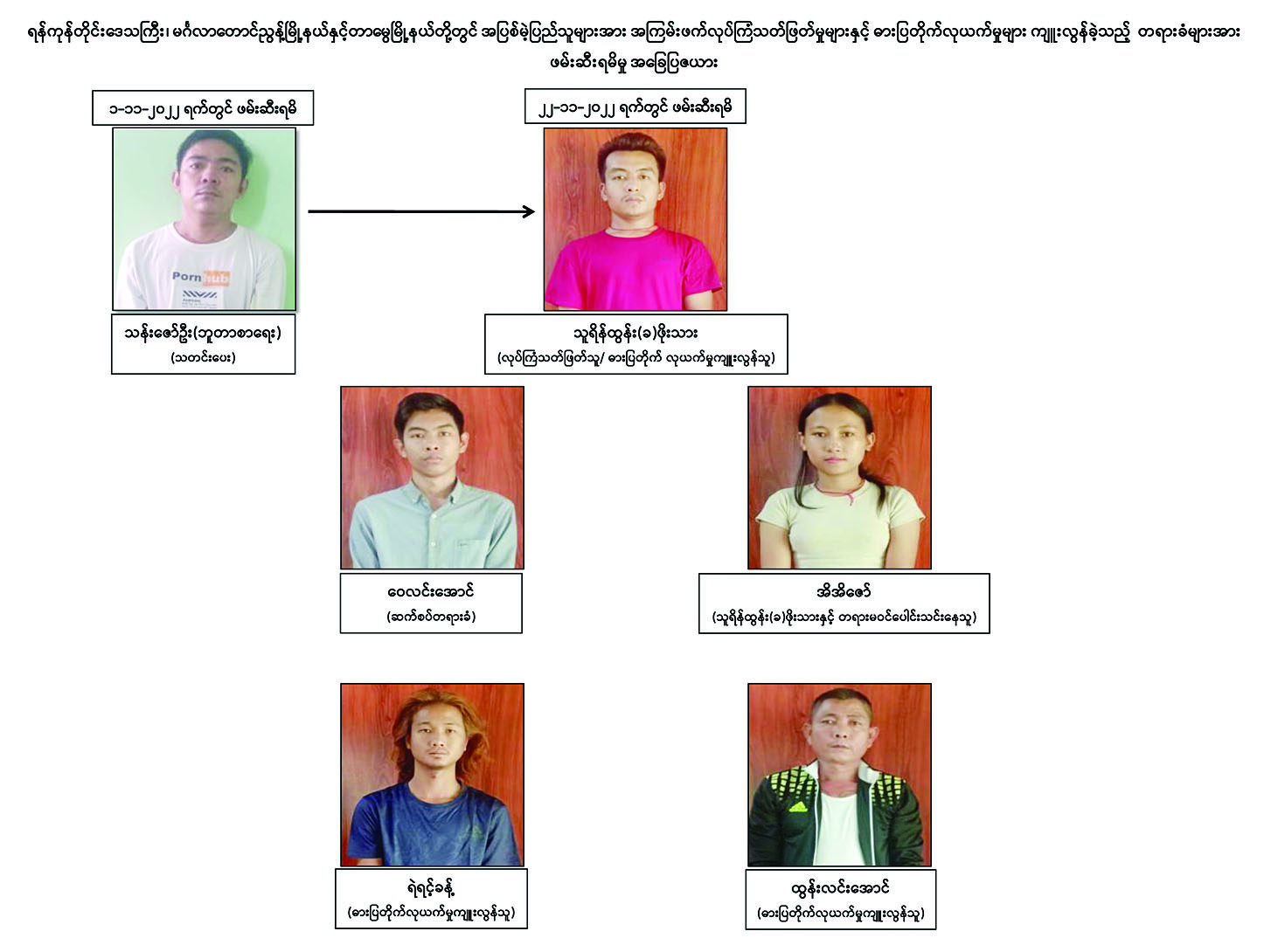 ဖမ်းဆီးရမိ တရားခံများ၏ ထွက်ဆိုချက်အရ ဖမ်းဆီးရန်ကျန် အားညီ၏ ခိုင်းစေမှုဖြင့် အပြစ်မဲ့ ပြည်သူများအား အကြောင်းမဲ့ လုပ်ကြံသတ်ဖြတ်မှု နှစ်ကြိမ်နှင့် နိုင်ငံတော်၏ အုပ်ချုပ်မှုယန္တရား ပျက်ပြားစေရန်နှင့် အပြစ်မဲ့ပြည်သူများ ထိတ်လန့်မှုဖြစ်စေရန် ရည်ရွယ်၍ အများပြည်သူနှင့် သက်ဆိုင်သော နေရာများတွင် အကြမ်းဖက်ဖောက်ခွဲမှု နှစ်ကြိမ် ကျူးလွန်ခဲ့ကြောင်း ဖော်ထုတ်သိရှိ ရသည်-