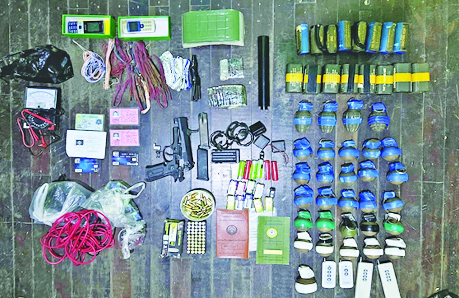 တရားခံ ထွန်းလင်းအောင်၏ ထွက်ဆိုချက်အရ ဒဂုံမြို့သစ် (ဆိပ်ကမ်း)မြို့နယ် အမှတ်(၉၄)ရပ်ကွက် ယုဇနဥယျာဉ်မြို့တော် တိုက်အမှတ်(၃၁) အခန်းအမှတ် (၃၀၃)၌ Glock ပစ္စတို တစ်လက်၊ Sig Sauer ပစ္စတိုတစ်လက်၊ အမျိုးအစား (စိစစ်ဆဲ) ပစ္စတိုတစ်လက်၊ ခြောက်လုံးပြူး တစ်လက်၊ ကျည် အိမ်မျိုးစုံ ခြောက်ခု၊ ကျည်မျိုးစုံ ၁၅၂ တောင့်၊ အသံတိတ်ပြောင်း ၁ ခု၊ လက်ပစ်ဗုံးမျိုးစုံ ၃၃ လုံး၊ ရှေ့ထွက်မိုင်း တစ်လုံး၊ TNT ယမ်းတောင့် ၁၆ တောင့်၊ ဒီတိုနေတာ အချောင်း ၁၀၀ နှင့် ဖောက်ခွဲရေး ဆက်စပ်ပစ္စည်းများအား သိမ်းဆည်းရမိခဲ့သည်။