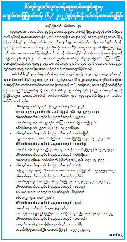 အိမ်တွင်းမှုသက်မွေးလုပ်ငန်းပညာသင်ကျောင်းများမှ ကျောင်းအခြေပြုသင်တန်း (၆/ ၂၀၂၂) ဖွင့်လှစ်ရန် သင်တန်းသားခေါ်ယူခြင်း 11/28/2022