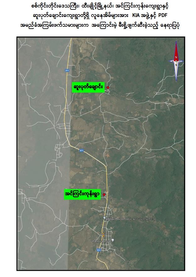 ထိုသို့ဆောင်ရွက်လျက်ရှိရာ စစ်ကိုင်းတိုင်းဒေသကြီး၊ ထီးချိုင့်မြို့နယ်၊ အင်ကြင်း ကုန်းကျေးရွာအတွင်း KIA အဖွဲ့နှင့် PDF အမည်ခံအကြမ်းဖက်သမားများက ဝင်ရောက် နေထိုင်၍ အဖျက်အမှောင့်လုပ်ငန်းများ လုပ်ဆောင်လျက်ရှိကြောင်း အကြမ်းဖက်မှုကို မလိုလားသည့် ကျေးရွာသားအချို့က လုံခြုံရေးတပ်ဖွဲ့ဝင်များထံသို့ လျှို့ဝှက်ဆက်သွယ် အကြောင်းကြားသတင်းပို့လာသဖြင့် လုံခြုံရေးတပ်ဖွဲ့ဝင်များက နိုဝင်ဘာ ၂၇ ရက် ၈ နာရီ ၅၀ မိနစ်ခန့်တွင် အဆိုပါကျေးရွာသို့သွားရောက်၍ လိုအပ်သည့် လုံခြုံရေး လုပ်ငန်းများ ဆောင်ရွက်ခဲ့ရာ KIA အဖွဲ့နှင့် PDF အမည်ခံ အကြမ်းဖက်သမားများက လက်နက်ကြီး၊ လက်နက်ငယ်များဖြင့် စတင်ပစ်ခတ် တိုက်ခိုက်ခဲ့သဖြင့် လုံခြုံရေးတပ်ဖွဲ့ဝင်များက ပြန်လည်ပစ်ခတ်တိုက်ခိုက်ခဲ့ရာ အကြမ်းဖက်အဖွဲ့များသည် ကျေးရွာ၏ အနောက်တောင်ဘက်သို့ ဆုတ်ခွာထွက်ပြေးသွားခဲ့ပြီး ၎င်းတို့ဆုတ်ခွာသွားစဉ် ကျေးရွာအတွင်းရှိ နေအိမ်မျာအား မီးရှို့ဖျက်ဆီးခဲ့သဖြင့် လူနေအိမ် ၄၀ လုံး မီးလောင် ဆုံးရှုံးခဲ့ကြောင်းသိရှိရသည်။
