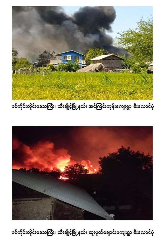 အလားတူ ထီးချိုင့်မြို့နယ်၊ ဆူးပုတ်ချောင်းကျေးရွာသို့ နိုဝင်ဘာ ၂၆ ရက် နံနက် ၆ နာရီခွဲခန့်တွင် PDF အမည်ခံ အကြမ်းဖက်သမားများ ကျေးရွာ၏ အနောက်တောင်ဘက်မှ ရောက်ရှိလာပြီး ကျေးရွာသူ/ ကျေးရွာသားများအား စုဝေး၍ ရွာပြင်သို့ထွက်ရန် အကြမ်းဖက် ခြိမ်းခြောက်ပြောဆိုပြီး ကျေးရွာအား အကြောင်းမဲ့မီးရှို့ဖျက်ဆီးခဲ့ရာ မီးလောင်မှုကြောင့် လူနေအိမ် ၄၀ လုံး၊ လက်တွန်းထွန်စက် ၆ စီး၊ စပါးချွေလှေ့စက် ၁ လုံး၊ မော်တော်ဆိုင်ကယ် ၂၀ စီး၊ မီးစက် ၂ လုံးနှင့် စပါးများ မီးလောင်ဆုံးရှုံးခဲ့ကြောင်း သိရှိရသည်။