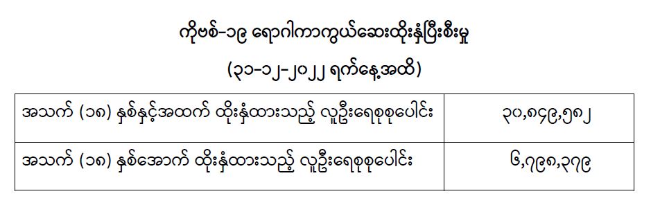 COVID-19 ရောဂါကာကွယ်ထိန်းချုပ်ရေးအတွက် တိုင်းဒေသကြီး/ပြည်နယ်များတွင် COVID-19 ရောဂါကာကွယ်ဆေးကို ဦးတည်အုပ်စုများသတ်မှတ်၍ ထိုးနှံပေးလျက်ရှိရာ (၃၁-၁၂-၂၀၂၂)ရက်နေ့အထိ အသက်(၁၈)နှစ်နှင့်အထက် လူဦးရေစုစုပေါင်း (၃၀,၈၄၉,၅၈၂) ဦးနှင့် အသက် (၁၈) နှစ်အောက်လူဦးရေစုစုပေါင်း (၆,၇၉၈,၃၇၉)ဦးတို့အား ထိုးနှံထားရှိပြီးဖြစ်ပါသည်။