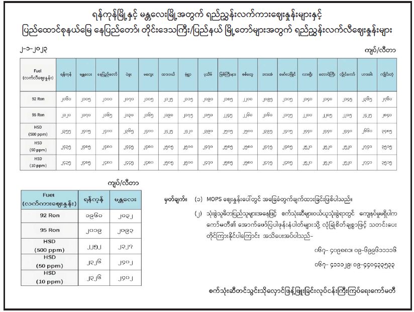 ရန်ကုန်မြို့နှင့် မန္တလေးမြို့အတွက် ရည်ညွှန်းလက်ကားဈေးနှုန်းများနှင့် ပြည်ထောင်စုနယ်မြေ နေပြည်တော်၊ တိုင်းဒေသကြီး/ ပြည်နယ် မြို့တော်များအတွက် ရည်ညွှန်းလက်လီဈေးနှုန်းများ 01/02/2023