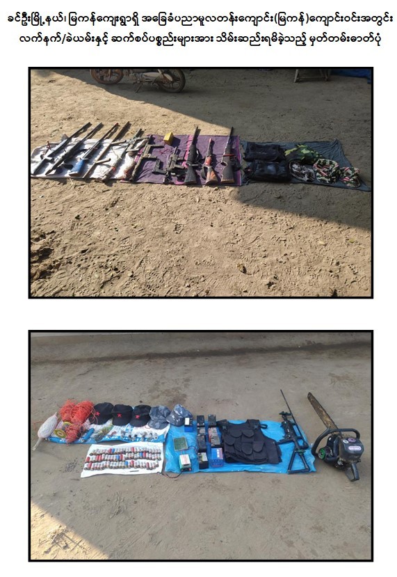 သို့ဖြစ်၍ PDF အမည်ခံ အကြမ်းဖက်အဖွဲ့များ၏ ယုတ်မာရိုင်းစိုင်းမှုကို ရွံရှာမုန်းတီးလျက်ရှိပြီး ကျောင်းဖွင့်လှစ်ပေးရန်လိုလားသော ကျောင်းသားမိဘများ၊ အကြမ်းဖက်မှုကိုမလိုလားသည့်ပြည်သူများ၏ လျှို့ဝှက်စွာသတင်းပေးပို့ချက်အရ ၂၀၂၃ ခုနှစ် ဇန်နဝါရီလ ၂ ရက် နံနက်ပိုင်းတွင် လုံခြုံရေးတပ်ဖွဲ့ဝင်များသည် စစ်ကိုင်းတိုင်းဒေသကြီး၊ ခင်ဦးမြို့နယ်၊ မြကန်ကျေးရွာရှိ အခြေခံပညာမူလတန်းကျောင်း (မြကန်)သို့ သွားရောက်ရှင်းလင်းရှာဖွေခဲ့ရာ ကျောင်းဝင်းအတွင်းမှ လက်လုပ်သေနတ် (အရှည်) ၇ လက်၊ လက်လုပ်ပစ္စတို ၁ လက်၊ လက်လုပ် RPG ၃ လက်၊ ၁၂ ဗို့ကျည် ၁၄၃ တောင့်၊ လက်လုပ်ရှေ့ထွက်မိုင်း ၆ လုံး၊ လက်လုပ် လက်ပစ်ဗုံး ၁ လုံး၊ ယမ်းမဲ ၂ ပိဿာ၊ ဆားကစ်ပြား ၂ ခု၊ ဆိုင်ကယ်ဘတ္ထရီအိုး ၁၃ လုံး၊ ဝါယာကြိုး ၃၀ ပေ၊ နိုင်လွန်ကြိုး ၃၀၀ ပေ၊ ကြေးနန်းကြိုး ၃၀ ပေ၊ ဆေးထိုးပိုက် ၆ ချောင်း၊ ပြောက်ကျားဦးထုပ် ၈ လုံး၊ ပြောက်ကျား အင်္ကျီ ၁ ထည်၊ ကျည်ကာအင်္ကျီ ၃ ထည်၊ ချိန်းဆော ၁ ခု၊ အင်ဗာတာ ၂ လုံး၊ လမ်းလျှောက်စကားပြောစက် ၈ လုံး၊ အားသွင်းခုံ ၂ ခု၊ ဖောက်ခွဲဖျက်ဆီးရေးတွင် အသုံးပြုမည့် ဆိုင်ကယ်ဘောစေ့ ၅၀ လုံးတို့အား သိမ်းဆည်း ရမိခဲ့သည်။