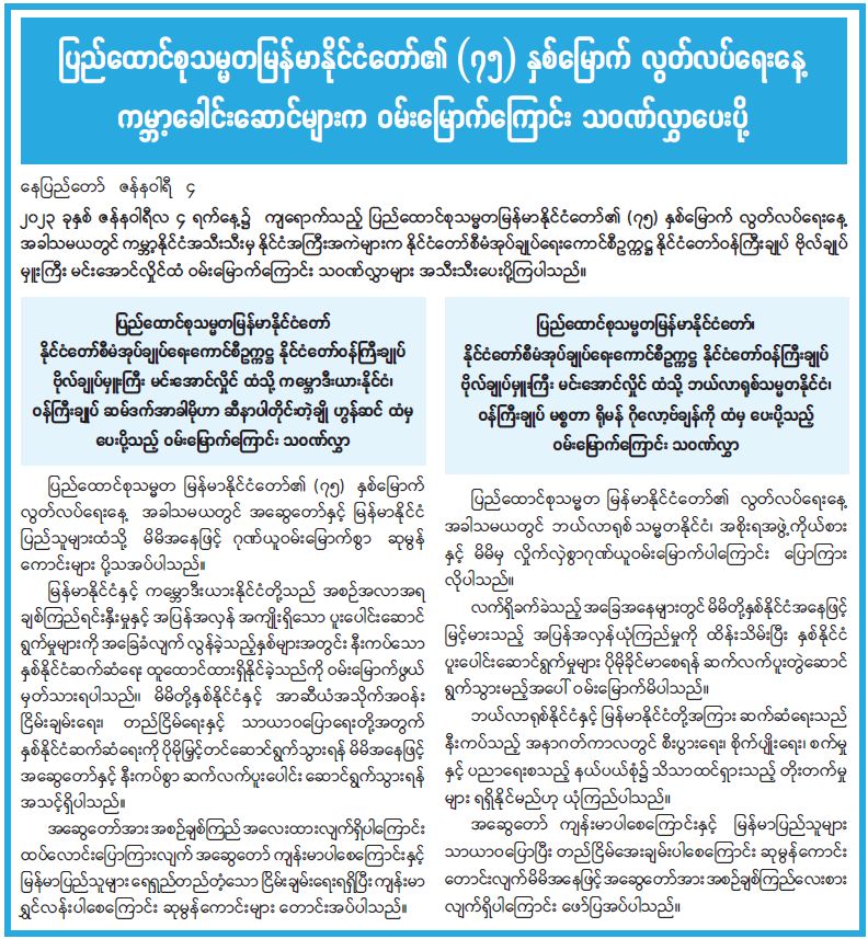 ပြည်ထောင်စုသမ္မတမြန်မာနိုင်ငံတော်၏ (၇၅) နှစ်မြောက် လွတ်လပ်ရေးနေ့ ကမ္ဘာ့ခေါင်းဆောင်များက ဝမ်းမြောက်ကြောင်း သဝဏ်လွှာပေးပို့
