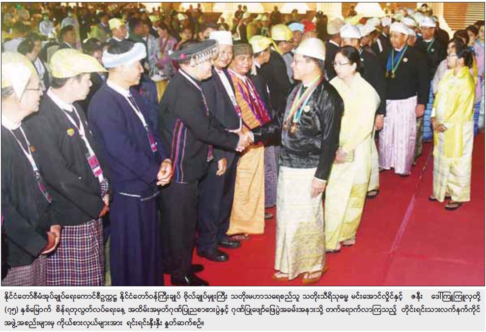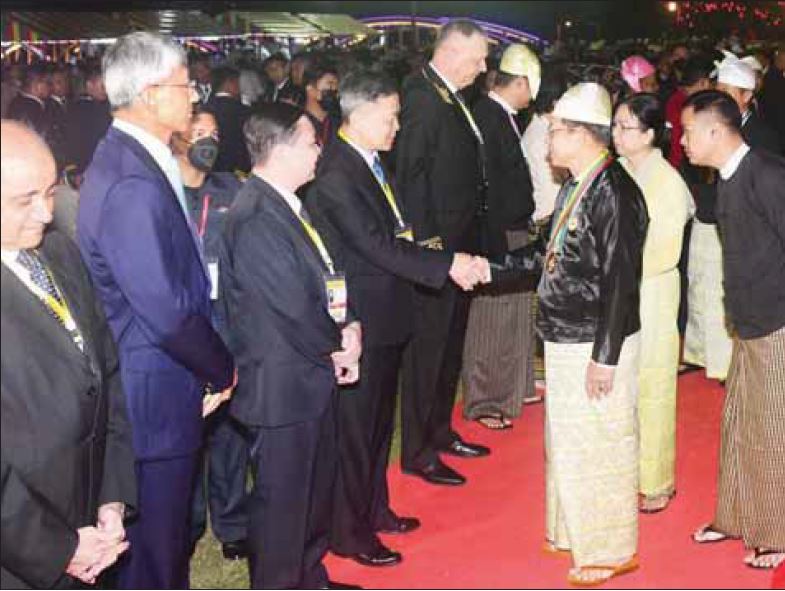 ထို့နောက် နိုင်ငံတော်စီမံအုပ်ချုပ်ရေးကောင်စီဥက္ကဋ္ဌ နိုင်ငံတော်ဝန်ကြီးချုပ် ဗိုလ်ချုပ်မှူးကြီး သတိုးမဟာသရေစည်သူ သတိုးသီရိသုဓမ္မ မင်းအောင်လှိုင်နှင့်ဇနီး ဒေါ်ကြူကြူလှတို့သည် ညစာစားပွဲအခမ်းအနား ကျင်းပရာနေရာသို့ ရောက်ရှိကြပြီး နိုင်ငံတော်စီမံအုပ်ချုပ်ရေးကောင်စီ   ဒုတိယဥက္ကဋ္ဌ ဒုတိယဝန်ကြီးချုပ်နှင့် ဇနီးတို့နှင့်အတူ နိုင်ငံရေးပါတီများမှ ဥက္ကဋ္ဌများနှင့် ကိုယ်စားလှယ်များ၊ နိုင်ငံခြားသံရုံးများမှ သံအမတ်ကြီးများနှင့် သံရုံးတာဝန်ခံများ၊ ဂုဏ်ထူးဆောင်          ကောင်စစ်ဝန်များနှင့် အထူးဖိတ်ကြားထားသည့် ဧည့်သည်တော်များကို ရင်းရင်းနှီးနှီး နှုတ်ဆက်သည်။