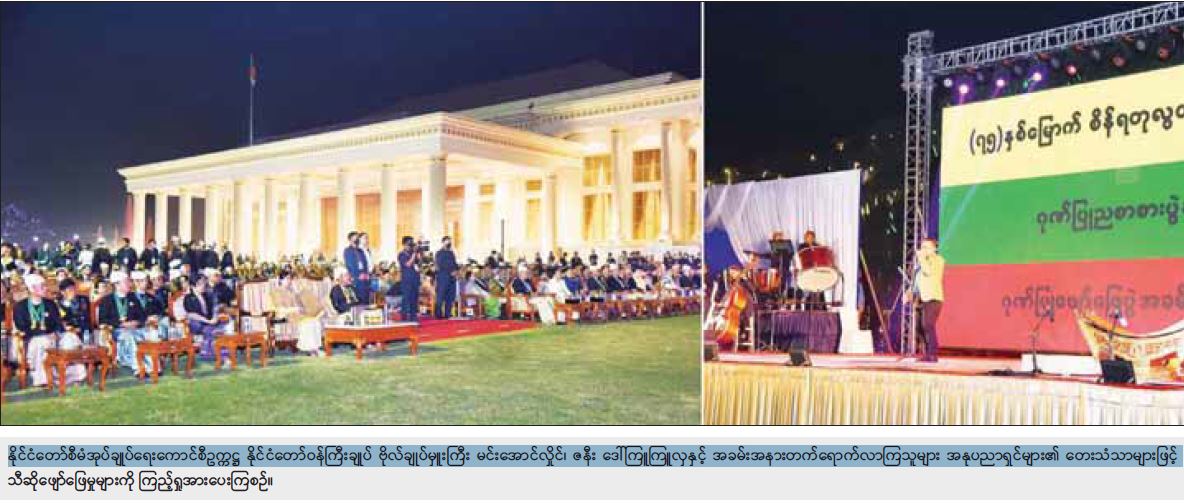 ယင်းနောက် နိုင်ငံတော် စီမံအုပ်ချုပ်ရေးကောင်စီဥက္ကဋ္ဌ နိုင်ငံတော်ဝန်ကြီးချုပ်နှင့် ဇနီးတို့သည်    ဂုဏ်ပြုညစာစားပွဲသို့ တက်ရောက်လာကြသူများနှင့်အတူ ညစာကို အတူတကွ သုံးဆောင်ကြသည်။ ညစာမသုံးဆောင်မီနှင့် သုံးဆောင်နေစဉ်အတွင်း ပြန်ကြားရေးဝန်ကြီးဌာန မြန်မာ့အသံနှင့် ရုပ်မြင်သံကြားမှ အနုပညာရှင်များနှင့် သာသနာရေးနှင့်ယဉ်ကျေးမှုဝန်ကြီးဌာန အနုပညာဦးစီးဌာနမှ အနုပညာရှင်များက တေးသံသာများဖြင့် သီဆိုတီးမှုတ်ဖျော်ဖြေကြသည်။
