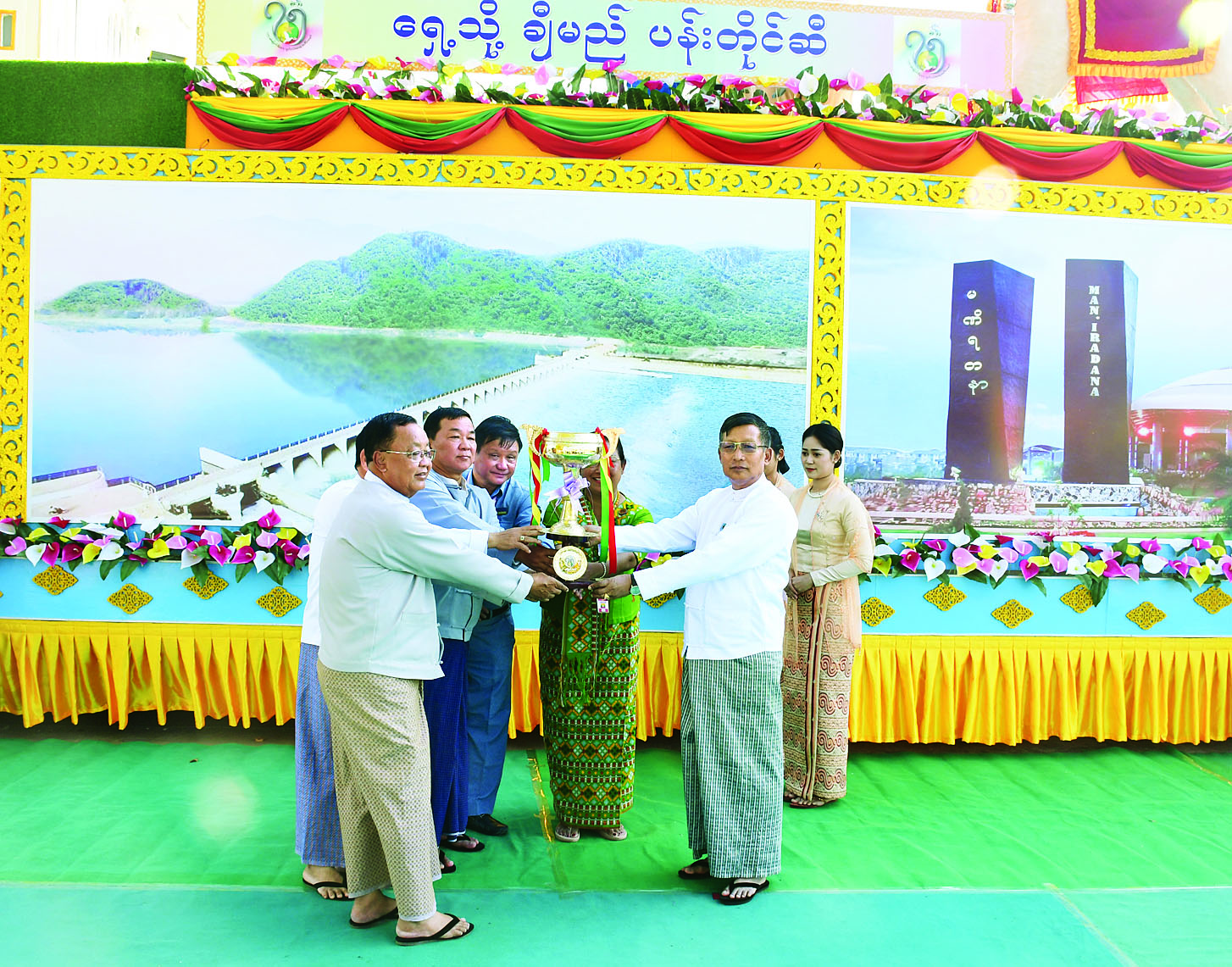 ဦးစွာ (၇၅) နှစ်မြောက် အထိမ်းအမှတ်ပြခန်းများ စီစဉ်ဆောင်ရွက်ရေးလုပ်ငန်းကော်မတီဥက္ကဋ္ဌ နေပြည်တော်ကောင်စီဥက္ကဋ္ဌ ဦးတင်ဦးလွင်က နေပြည်တော်ကိုယ်စားပြု ဂုဏ်ပြုယာဉ် တည်ဆောက် ရေးဆပ်ကော်မတီကို ဂုဏ်ပြုယာဉ် အထူးဆုတံဆိပ်၊ (၇၅) နှစ်မြောက် စိန်ရတုလွတ်လပ်ရေးနေ့ အထိမ်းအမှတ်ပြခန်းများ ဆောက်လုပ်ရေး ဆပ်ကော်မတီနှင့် ဖွင့်ပွဲအခမ်းအနား ကျင်းပရေးဆပ်ကော်မတီကို ဂုဏ်ပြုဆုတံဆိပ်၊ အထိမ်းအမှတ်ပြခန်းများ ဆောက်လုပ်ရေးဆပ်ကော်မတီနှင့် နေပြည်တော် ကိုယ်စားပြုဂုဏ်ပြုယာဉ် တည်ဆောက်ရေးဆပ်ကော်မတီအား နိုင်ငံတော်စီမံအုပ်ချုပ်ရေး ကောင်စီ၏ ဂုဏ်ပြုဆုငွေကျပ်သိန်း (၁၀၀)၊ အထိမ်း အမှတ်ပြခန်းများ ဆောက်လုပ်ရေးဆပ်ကော်မတီနှင့် နေပြည်တော်ကိုယ်စားပြုဂုဏ်ပြုယာဉ် တည်ဆောက်ရေးဆပ်ကော်မတီအား ဂုဏ်ပြုဆုငွေကျပ် (၂၅)သိန်းတို့ကို ချီးမြှင့်ရာ ဆောက်လုပ်ရေးဝန်ကြီးဌာန ဒုတိယဝန်ကြီး ဦးဝင်းဖေ၊ နေပြည်တော်ကောင်စီ အဖွဲ့ဝင် ဦးမြင့်စိုး၊ နေပြည်တော်စည်ပင်သာယာရေး ကော်မတီဒုတိယမြို့တော်ဝန် ဦးမောင်မောင်၊ နေပြည်တော်စည်ပင်သာယာရေးကော်မတီ အမြဲတမ်းအတွင်းဝန် ဦးမျိုးအောင်နှင့် နေပြည်တော် လမ်းဦးစီးဌာန ညွှန်ကြားရေးမှူး ဒေါ်နွယ်နီထွန်းတို့က လက်ခံရယူကြသည်။