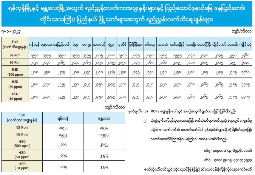 ရန်ကုန်မြို့နှင့် မန္တလေးမြို့အတွက် ရည်ညွှန်းလက်ကားဈေးနှုန်းများနှင့် ပြည်ထောင်စုနယ်မြေ နေပြည်တော်၊ တိုင်းဒေသကြီး/ ပြည်နယ် မြို့တော်များအတွက် ရည်ညွှန်းလက်လီဈေးနှုန်းများ 01/07/2023