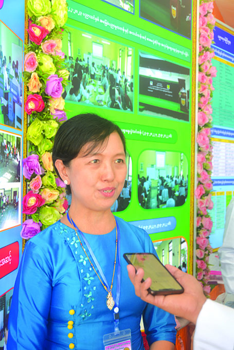 ပညာရေးဝန်ကြီးဌာနက (၇၅) နှစ်မြောက် စိန်ရတုလွတ်လပ်ရေးနေ့ပြပွဲမှာ ဌာနတက္ကသိုလ်စုစုပေါင်း ၁၈ ခုကနေ ပါဝင်ပြသပါတယ်။ ပြခန်းနံရံတွေမှာ ပညာရေးဌာနအသီးသီးရဲ့ လုပ်ဆောင်ချက်တွေကို ဖော်ပြထားပါတယ်။ ကျွန်မတို့ဌာနအနေနဲ့ သင်ရိုးညွှန်းတမ်း kg+12 ရဲ့ သင်ရိုးညွှန်းတမ်းတွေကို ရေးဆွဲပေးရပါတယ်။ ရေးဆွဲတဲ့အါ မူ၊ လယ်၊ ထက်ဆိုပြီးရှိပါတယ်။ မူလတန်းကို JICA က နည်းပညာ အထောက်အပံ့နဲ့လုပ်ပါတယ်။ အလယ်တန်းနဲ့ အထက်တန်းတွေကိုတော့ ADB ရဲ့ ချေးငွေနဲ့ သင်ရိုးညွှန်းတမ်းတွေကိုပြုစုပါတယ်။ မူလတန်း Grade 1to 5 ၊ အထက်တန်း Grade 10 to 12 စနစ်နဲ့ သင်ရိုးတွေကို ပြုစုပါတယ်။ ယခုနှစ်မှာ Grade 9 နဲ့ Grade 12 ပဲ ကျန်ပါတော့တယ်။ အဲဒီတော့ ပြီးသွားတဲ့ Grade အသီးသီးရဲ့စာအုပ်တွေကို ဒီပြခန်းမှာပြသပါတယ်။ ကျောင်းသား ကျောင်းသူများအတွက် သင်ရိုးစာအုပ်အပြင် ဆရာတွေအတွက်ထုတ်ဝေထားတဲ့ ဆရာလမ်းညွှန်စာအုပ်တွေပါ ခင်းကျင်းပြသထားပါတယ်။ တိုင်းရင်းသားဘာသာစကားဦးစီးဌာန အနေနဲ့လည်း ထုတ်ဝေထားတဲ့စာအုပ်တွေကို ပြသတာအပြင် ရောင်းချပေးပါသေးတယ်။ အဆင့်မြင့်ပညာဦးစီးဌာနကသုတေသနပြခန်း။ အဓိကအဏ္ဏဝါနဲ့ ပတ်သက်တဲ့ပြခန်းတွေထဲမှာ မြိတ်တက္ကသိုလ်က လာရောက်ပြသတဲ့ပြခန်း၊ စစ်တွေတက္ကသိုလ်က လာရောက်ပြသတဲ့ အဏ္ဏဝါပြခန်း၊ ပုသိမ်အဏ္ဏဝါပြခန်းအပြင် ဒဂုံတက္ကသိုလ်၊ မန္တလေးတက္ကသိုလ်က လာရောက်ပြသတဲ့ ပြခန်းတွေနဲ့စပါးခွံနဲ့ အုတ်ဖုတ်တဲ့နည်းစနစ်ပြကွက်တွေရှိပါတယ်။ ပြခန်းကို ကျောင်းသား ကျောင်းသူလေးတွေ စိတ်ဝင်စားမှုအပြည့်နဲ့ လေ့လာကြည့်ရှုတဲ့အပြင် စာအုပ် စာစောင်လေးတွေကို ဝယ်ယူအားပေးကြတာလည်းရှိပါတယ်။ (၇၅)နှစ်မြောက် စိန်ရတုလွတ်လပ်ရေးနေ့မှာ ပညာရေးဌာနတွေအနေနဲ့ တစ်တပ်တစ်အား ပါဝင်ပြသခွင့်ရတဲ့အတွက် ပညာရေးတင်မကဘဲ ပြည်သူလူထုအားလုံးကို သိစေချင်တာတွေ ဖြန့်ဝေခွင့်ရတာလည်း အများကြီးကျေးဇူးတင်ပါတယ်။