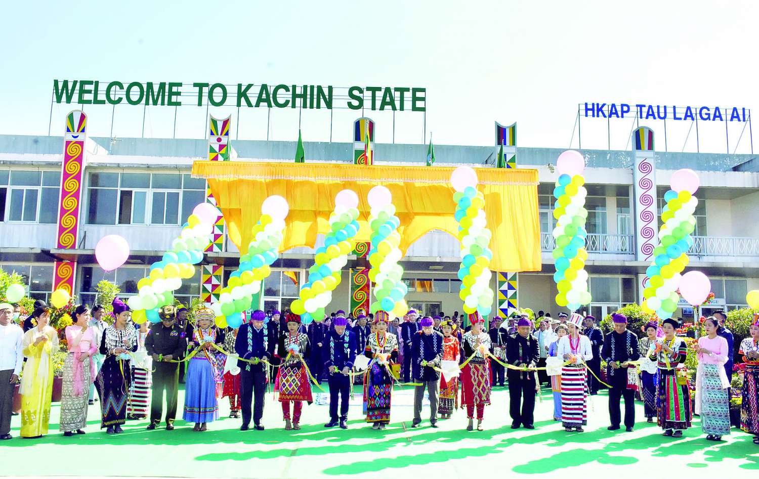 ထို့နောက် နိုင်ငံတော်စီမံအုပ်ချုပ်ရေးကောင်စီအဖွဲ့ဝင်များ၊ ပြည်ထောင်စုဝန်ကြီးများ၊ ပြည်နယ်ဝန်ကြီးချုပ်နှင့် ဒုတိယဝန်ကြီးများသည် (၇၅)နှစ်မြောက် စိန်ရတုကချင်ပြည်နယ်နေ့ကို ကြိုဆိုဂုဏ်ပြုသောအားဖြင့် ဖွင့်လှစ်မည့်လေဆိပ်ဝင်းအတွင်းရှိ လေဆိပ်ပန်းဥယျာဉ်ဖွင့်ပွဲအခမ်းအနားသို့ တက်ရောက်ကြသည်။
