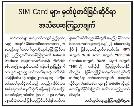 SIM Card မှတ်ပုံတင်ခြင်းဆိုင်ရာ အသိပေးကြေညာချက်