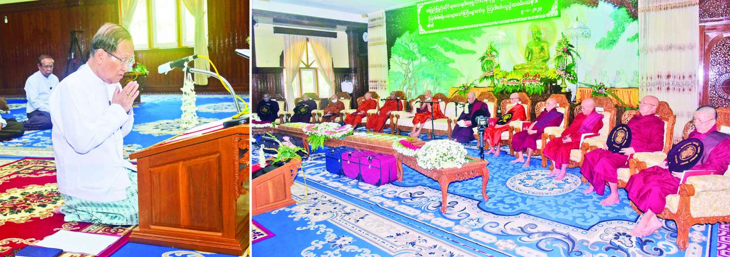 ယင်းနောက် ပြည်ထောင်စုဝန်ကြီးနှင့် တာဝန်ရှိသူများသည် ကြွရောက်တော်မူလာကြသော အပြည်ပြည်ဆိုင်ရာ ထေရဝါဒဗုဒ္ဓ သာသနာပြုတက္ကသိုလ် သြဝါဒါစရိယ ဆရာတော်ကြီးများကို နဝကမ္မနှင့် လှူဖွယ်ဝတ္ထုပစ္စည်းများ ဆက်ကပ်လှူဒါန်းကြပြီး အပြည်ပြည်ဆိုင်ရာ ထေရဝါဒဗုဒ္ဓသာသနာပြုတက္ကသိုလ်၊ သြဝါဒါစရိယအဖွဲ့ ဒုတိယဥက္ကဋ္ဌ၊ တက္ကသိုလ် ဒုတိယအဓိပတိ၊ နိုင်ငံတော် သံဃမဟာနာယကအဖွဲ့ အကျိုးတော်ဆောင်ဆရာတော်ထံမှ အနုမောဒနာတရားနာကြား၍ ရေစက်သွန်းလောင်း အမျှပေးဝေကြကာ အခမ်းအနားကို ရုပ်သိမ်းလိုက်ကြောင်း သိရသည်။