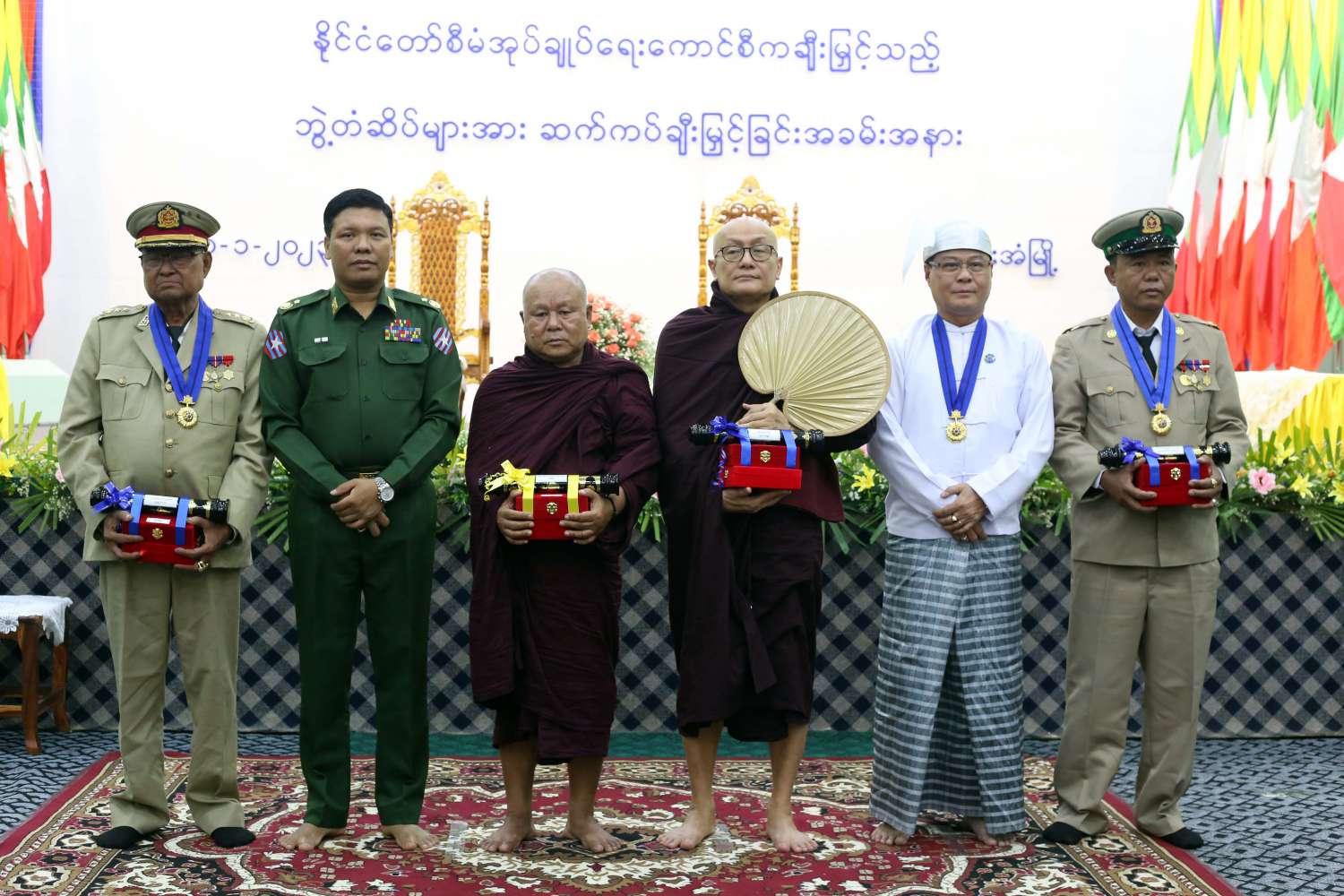 ထို့နောက် အရှေ့တောင်တိုင်းစစ်ဌာနချုပ်တိုင်းမှူး ဗိုလ်ချုပ်မြတ်သက်ဦးက သီရိပျံချီဘွဲ့ ရရှိသော တိုးတက်သောဗုဒ္ဓဘာသာ ကရင်အမျိုးသားအစည်းအရုံး နယ်ခြားစောင့်တပ်များ ဗဟိုအကြံပေးနှင့် ကွပ်ကဲရေးအဖွဲ့ဥက္ကဋ္ဌ ဂုဏ်ထူးဆောင် ဗိုလ်မှူးကြီး စောထွန်းလှိုင် နှင့် နယ်ခြားစောင့်တပ်များဗဟိုအကြံပေးနှင့် ကွပ်ကဲရေးအဖွဲ့ ဟောင်သရောအထူးဒေသမှ ဂုဏ်ထူးဆောင် ဒုတိယဗိုလ်မှူးကြီးစောဒေါဒေါ(ကိုယ်စား) ဗိုလ်မှူးစောချစ်ဝင်းတို့အား ဂုဏ်ထူးဆောင်ဘွဲ့များ ချီးမြှင့်အပ်နှင်းသည်။