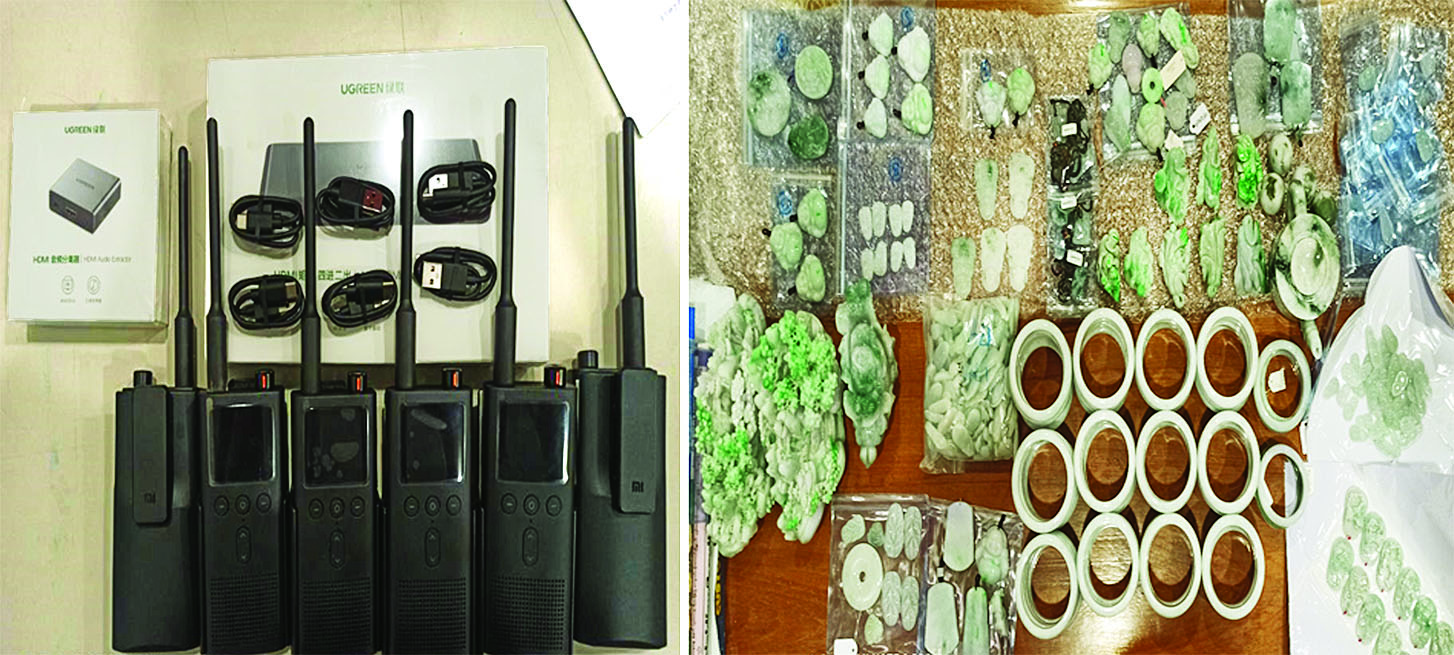 တရားမဝင်ကုန်သွယ်မှုတိုက်ဖျက်ရေးဦးဆောင်ကော်မတီ၏ ကြီးကြပ်ကွပ်ကဲမှုဖြင့် တရားမဝင်ကုန်သွယ်မှုများကို ဥပဒေနှင့်အညီ ထိရောက်စွာတားဆီးအရေးယူနိုင်ရေး ဆောင်ရွက်လျက်ရှိရာ အကောက်ခွန်ဦးစီးဌာန၏ စီမံခန့်ခွဲမှုဖြင့် တာဝန်ကျအကောက်ခွန်အဖွဲ့များကစစ်ဆေးမှုများ ဆောင်ရွက်ခဲ့ရာ ဇန်နဝါရီ ၁၁ ရက်တွင် ရန်ကုန်အပြည်ပြည် ဆိုင်ရာလေဆိပ်၌ ခရီးသည် ဝန်စည်များအတွင်းမှ သက်ဆိုင်ရာတင်သွင်းခွင့်ထောက်ခံချက်မပါရှိသော MI Walkie-Talkie ခြောက်လုံး၊ ကျောက်စိမ်းဟုယူဆရသော ဆွဲသီးအသေး ၂၄၅ ခုအပါအဝင် ကုန်ပစ္စည်း ၁၀ မျိုး(ခန့်မှန်းတန်ဖိုး ငွေကျပ် ၃၀၀၀၀၀၀)ကိုလည်းကောင်း၊ ဇန်နဝါရီ ၁၂ ရက်တွင် မြန်မာစက်မှုဆိပ်ကမ်း ကုန်သေတ္တာစစ်ဆေးရေးစခန်း၌ ကုန်သေတ္တာတစ်လုံးအတွင်းမှ သွင်းကုန်ကြေညာလွှာ(ID)တွင် ကြေညာ ထားခြင်းမရှိသော Polymex Powder ၂၀၀၀ ကီလိုဂရမ် အပါအဝင်ကုန်ပစ္စည်းနှစ်မျိုး (ခန့်မှန်း တန်ဖိုးငွေကျပ် ၈၄၀၀၀၀၀)ကို လည်းကောင်း၊ မြဝတီ-ဘားအံ-ရန်ကုန် လမ်းကြောင်းအတိုင်း မောင်းနှင်လာသည့် မော်တော်ယာဉ်တစ်စီးပေါ်မှ သွင်းကုန်ကြေညာလွှာ(ID)တွင် ကြေညာထားသည်နှင့် ကိုက်ညီမှုမရှိသော LED BULB များ၊ SOLAR BULB များအပါအဝင် ကုန်ပစ္စည်းရှစ်မျိုး (ခန့်မှန်းတန်ဖိုးငွေကျပ် ၂၀၂၃၄၁၆၄)နှင့် အဆိုပါပစ္စည်းများတင်ဆောင်လာသော MITSUBISHI FUSO အမျိုးအစားမော်တော်ယာဉ်တစ်စီး (ခန့်မှန်းတန်ဖိုးငွေကျပ် ၄၀၀၀၀၀၀၀) ကိုလည်းကောင်း၊ စုစုပေါင်းခန့်မှန်းတန်ဖိုးငွေကျပ် ၇၁၆၃၄၁၆၄)ကို ဖမ်းဆီးရမိခဲ့ပြီး အကောက်ခွန်လုပ်ထုံးလုပ်နည်းနှင့်အညီ အရေးယူဆောင်ရွက်လျက်ရှိသည်။