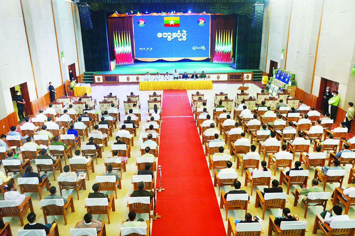 ဦးစွာ နိုင်ငံတော်စီမံအုပ်ချုပ်ရေး ကောင်စီအဖွဲ့ဝင် စောဒန်နီယယ်၊ ပြည်ထောင်စုဝန်ကြီး ဒုတိယ ဗိုလ်ချုပ်ကြီး ထွန်းထွန်းနောင်နှင့် ဦးစောထွန်းအောင်မြင့်တို့က နိုင်ငံတော်စီမံအုပ်ချုပ်ရေးကောင်စီ၏ ရှေ့လုပ်ငန်းစဉ်(၅)ရပ် နှင့်အညီ နိုင်ငံတော်ဖွံ့ဖြိုးတိုးတက်ရေးနှင့် တည်ငြိမ်ရေးအတွက် နိုင်ငံတော်စီမံအုပ်ချုပ် ရေးကောင်စီက တာဝန်ယူ ဆောင်ရွက်နေမှုများကို ရှင်းလင်း ပြောကြားကြသည်။
