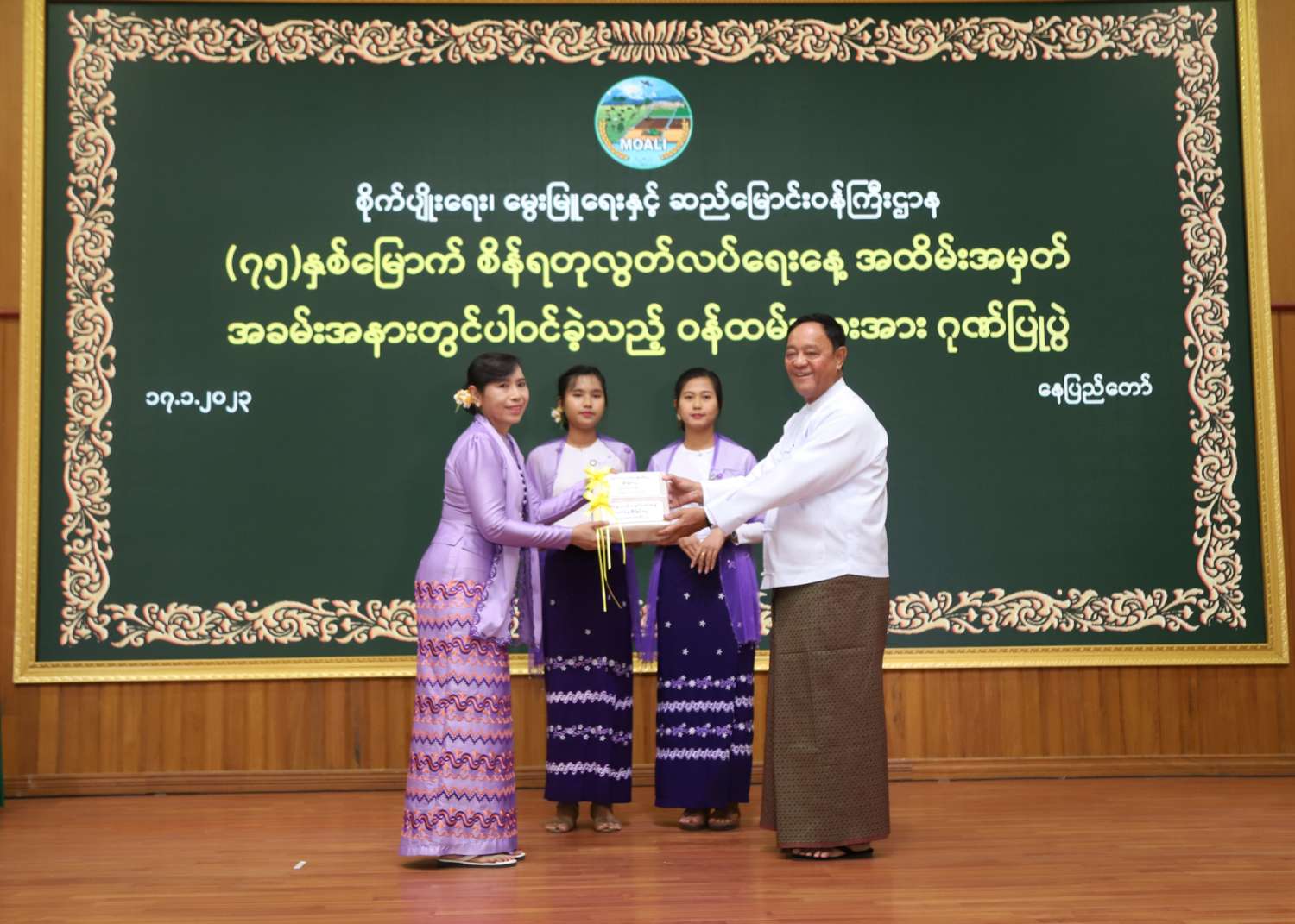 (၇၅)နှစ်မြောက် စိန်ရတုလွတ်လပ်ရေးနေ့ ဂုဏ်ပြုအခမ်းအနားတွင် စိုက်ပျိုးရေး၊ မွေးမြူရေးနှင့် ဆည်မြောင်းဝန်ကြီးဌာန ကိုယ်စားပြု စစ်ရေးပြတပ်ခွဲ၊ ဂုဏ်ပြုယာဉ်၊ ပြခန်းတို့၌ ပါဝင်ဆောင်ရွက်ခဲ့ကြသော ဝန်ထမ်းများနှင့် အားကစားပြိုင်ပွဲဆုရသူများအား ဂုဏ်ပြုချီးမြှင့်ခြင်း အခမ်းအနားကို ယနေ့နံနက်ပိုင်းက အဆိုပါဝန်ကြီးဌာန၌ ကျင်းပသည်။