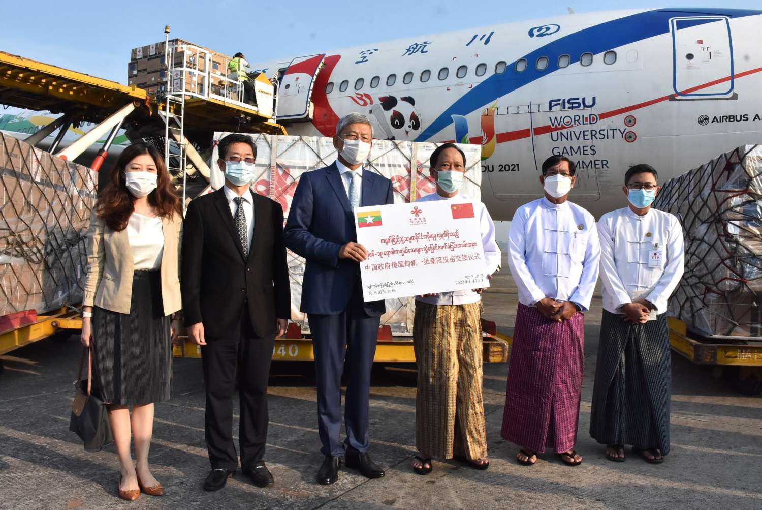 တရုတ်ပြည်သူ့သမ္မတနိုင်ငံမှ မြန်မာနိုင်ငံသို့ လှူဒါန်းသည့် ကိုဗစ်-၁၉ရောဂါ ကာကွယ်ဆေး Sinopharm (၃) သန်း doses နှင့် ဆေးထိုးအပ် (၃)သန်းတို့သည် ယနေ့နံနက် ၇ နာရီတွင် ရန်ကုန်အပြည်ပြည်ဆိုင်ရာလေဆိပ်သို့ ရောက်ရှိခဲ့ပြီး လွှဲပြောင်းလက်ခံခြင်း အခမ်းအနားကို ရန်ကုန်အပြည်ပြည်ဆိုင်ရာလေဆိပ်ရှိ အရေးကြီးပုဂ္ဂိုလ်များ ဧည့်ခန်းမဆောင်၌ ကျင်းပရာ ကျန်းမာရေးဝန်ကြီးဌာန၊ ပြည်ထောင်စုဝန်ကြီး ဒေါက်တာသက်ခိုင်ဝင်း၊ တရုတ်ပြည်သူ့သမ္မတနိုင်ငံသံအမတ်ကြီး Mr. Chen Hai နှင့် ရန်ကုန်တိုင်း ဒေသကြီးဝန်ကြီးချုပ် ဦးစိုးသိန်း တို့ တက်ရောက်ကြသည်။