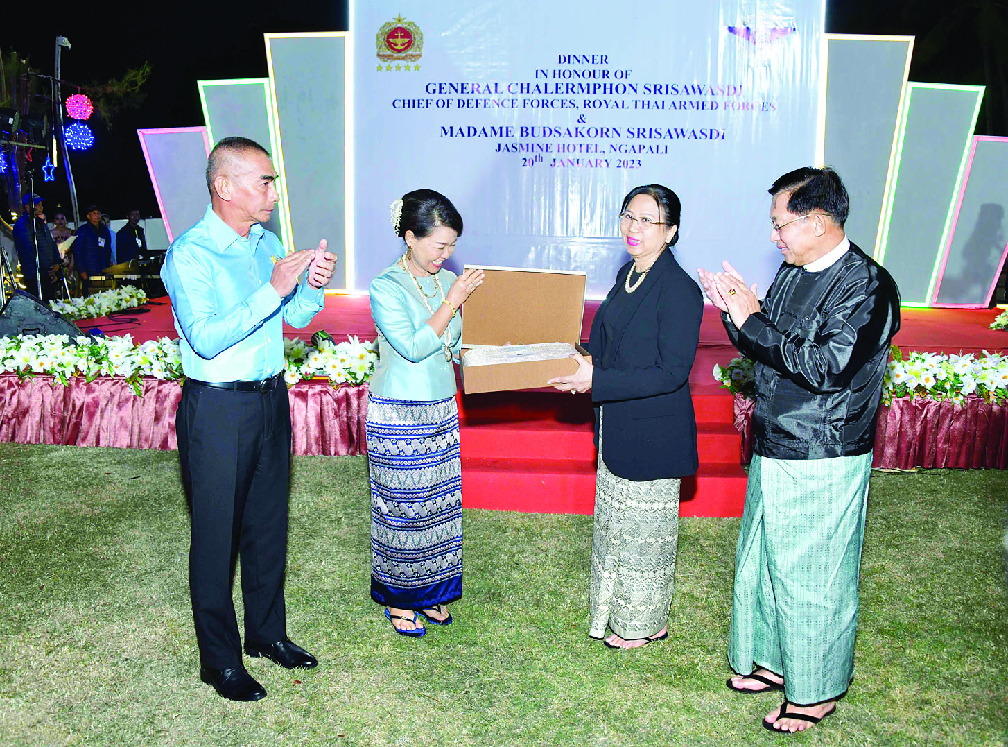 ထိုင်းဘုရင့်တပ်မတော်ကာကွယ်ရေးဦးစီးချုပ်နှင့် ဇနီး ဦးဆောင်သည့် ကိုယ်စားလှယ်အဖွဲ့အား နိုင်ငံတော်စီမံအုပ်ချုပ်ရေးကောင်စီဥက္ကဋ္ဌ တပ်မတော်ကာကွယ်ရေးဦးစီးချုပ် ဗိုလ်ချုပ်မှူးကြီး မင်းအောင်လှိုင်နှင့် ဇနီးတို့က ဂုဏ်ပြုညစာဖြင့် တည်ခင်းဧည့်ခံ