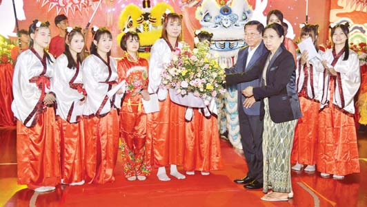 ထို့နောက် ၂၀၂၃ ခုနှစ် တရုတ်နှစ်သစ်ကူး ပွဲတော်အထိမ်းအမှတ် ချစ်ကြည်ရေး ဘတ်စကက် ဘောပြိုင်ပွဲ ပိတ်ပွဲနှင့် တရုတ်နှစ်သစ်ကူးပွဲတော် အခမ်းအနားအထိမ်းအမှတ် ညစာစားပွဲကို ကျင်းပ ပြုလုပ်ရာ ဦးစွာတရုတ်ရိုးရာ ခြင်္သေ့မျက်လုံးဖွင့် မင်္ဂလာအခမ်းအနားကိုပြုလုပ်ခဲ့ပြီး နိုင်ငံတော်စီမံအုပ်ချုပ်ရေးကောင်စီဥက္ကဋ္ဌ နိုင်ငံတော်ဝန်ကြီးချုပ်နှင့်ဇနီးတို့က တရုတ်ရိုးရာခြင်္သေ့အား တရုတ်ထုံးတမ်း စဉ်လာများနှင့်အညီ ဂုဏ်ပြုဆေးခြယ်သပေးသည်။